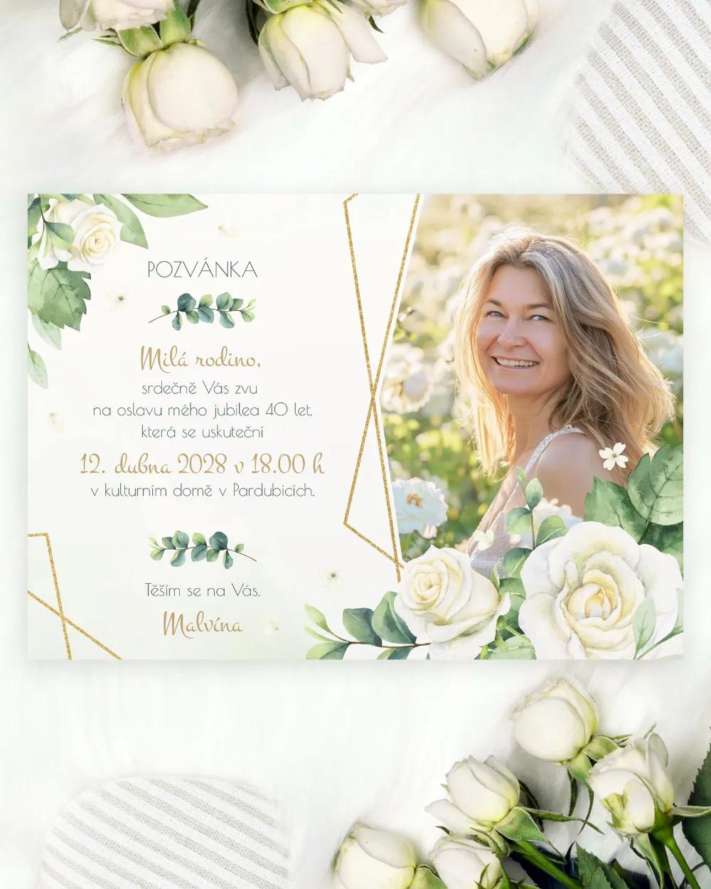 Květinová pozvánka s bílými růžemi a zeleným pozadím potěší milovníky přírody a ladí s výzdobou narozeninové hostiny.