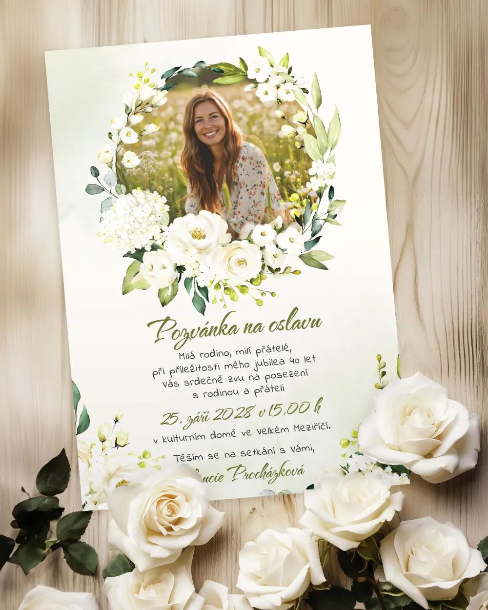 Pozvánka s bílými růžemi a zeleným věncem je ideální pro jemnou narozeninovou oslavu s přírodní výzdobou ve svěžích tónech.
