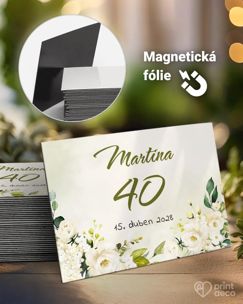 Jemné bílé růže doplněné zelenými lístky ve tvaru kruhu, uprostřed kterého se vyjímá věk oslavence, tvoří krásnou pozvánku na narozeninovou oslavu, která se ponese v těchto jemných tónech. Ve stejném motivu si u nás můžete vybrat také jmenovky či etikety na lahve, aby bylo vše dokonale sladěné.
