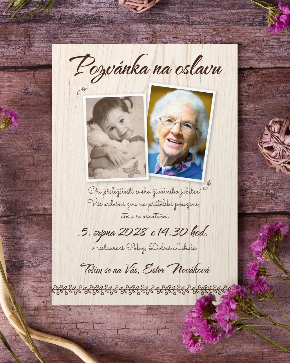 Pozvánka na narozeniny s motivem dřeva a čistým designem je vkusnou formou, jak pozvat hosty na osobní a elegantní oslavu.