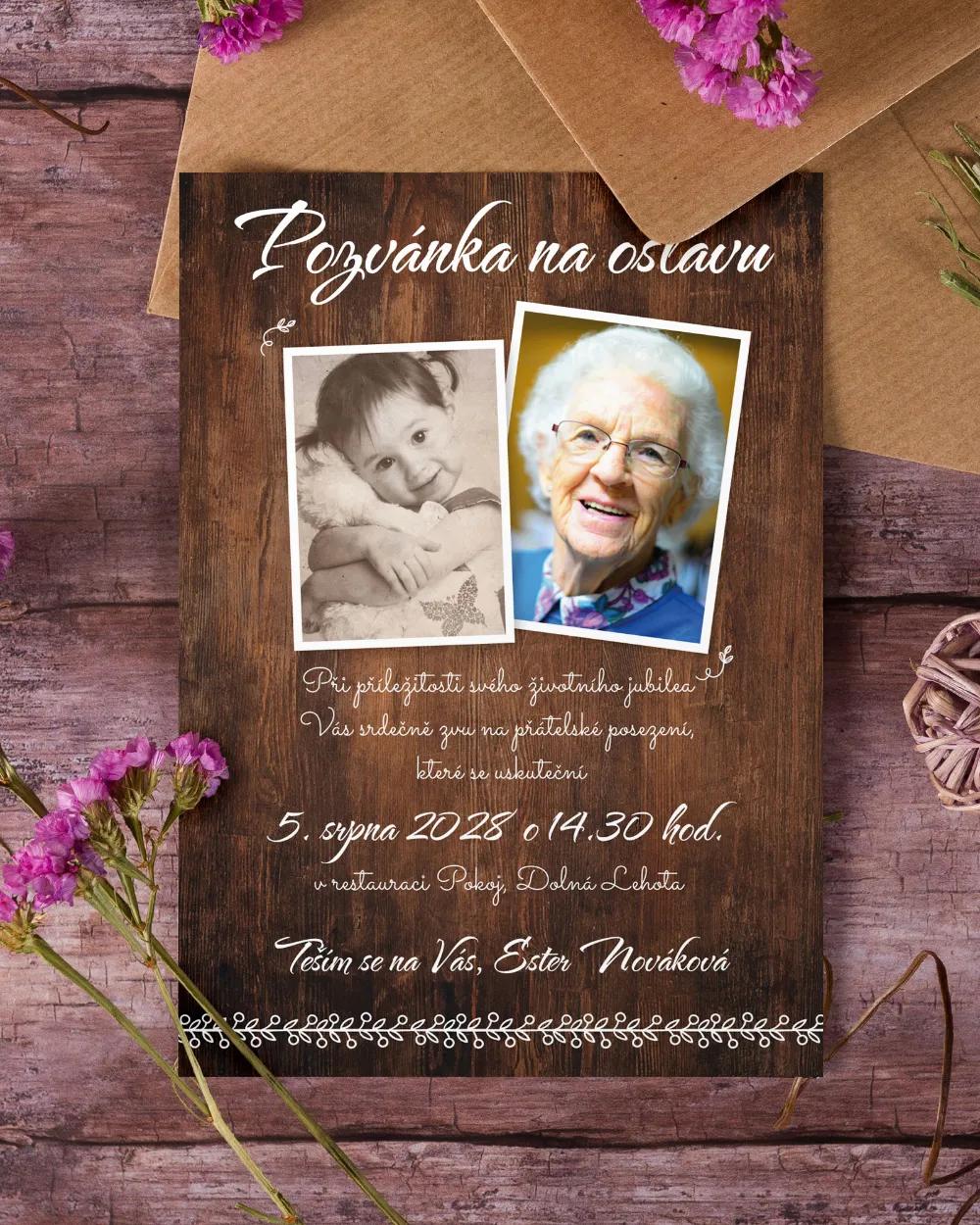 Rustikální pozvánka s dřevem a bílými ornamenty je ideální pro narozeninovou oslavu v přírodním nebo venkovském stylu.