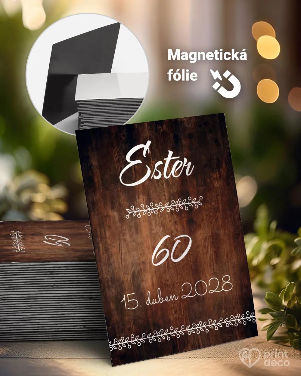 Netradiční narozeninová pozvánka s motivem dřeva je doplněna bílými ornamenty a textem s pozváním na oslavu. Skvěle se hodí pro oslavu v přírodním duchu nebo s rustikální výzdobou. V našem sortimentu k ní najdete i další ladící tiskoviny, jako jsou jmenovky či etikety na lahve, které pomohou vytvořit krásný celkový dojem.