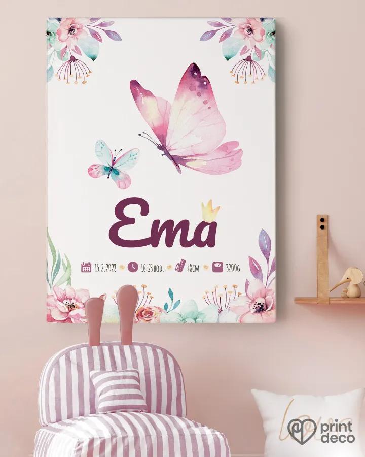 Dětský plakát s akvarelovým miminkem obklopeným růžovými květy a jemnými přírodními detaily. Personalizovaný motiv s údaji o narození dostupný na papíře i plátně.