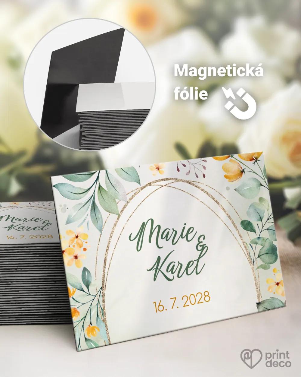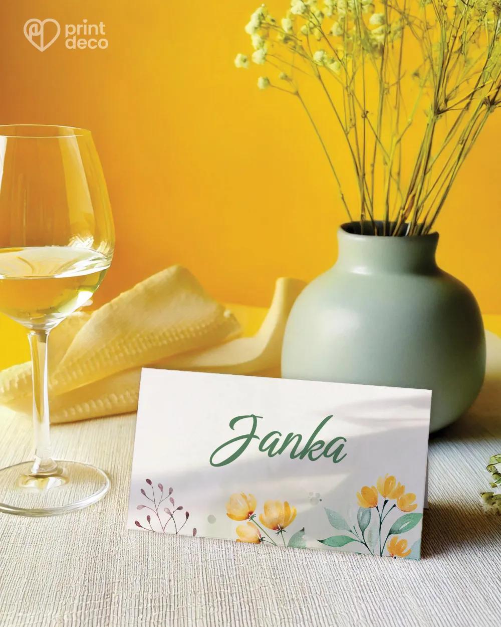 Svatební pozvánka ke stolu s jemným motivem žlutých květů v akvarelovém stylu je krásným doplňkem k oznámením ve stejném přírodním duchu. Světlé zelené listy a něžné žluté kvítky vytvářejí svěží a radostnou atmosféru, která dokonale ladí se svatbami v přírodním nebo vintage stylu. Text „Srdečně vás zveme ke svatebnímu stolu“ si můžete upravit podle svého přání přes náš online editor zdarma. Díky expresní výrobě a nejvyšší kvalitě tisku budou vaše pozvánky reprezentativní a sladěné do posledního detailu.