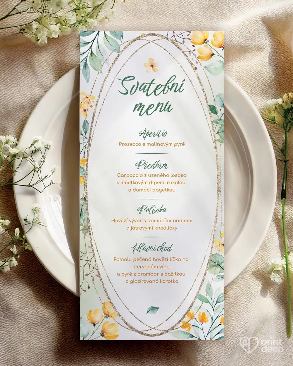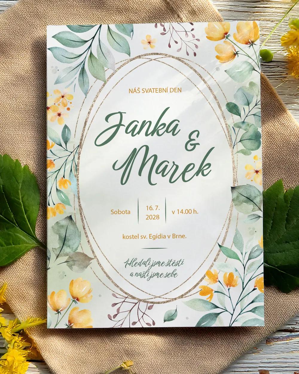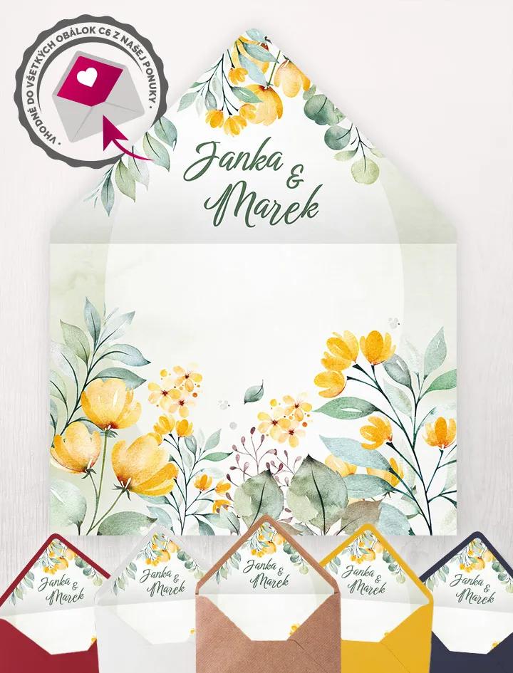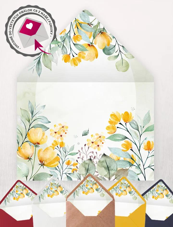 Svatební pozvánka ke stolu se žlutými květy v akvarelu. Úprava zdarma, expresní tisk, nejvyšší kvalita.