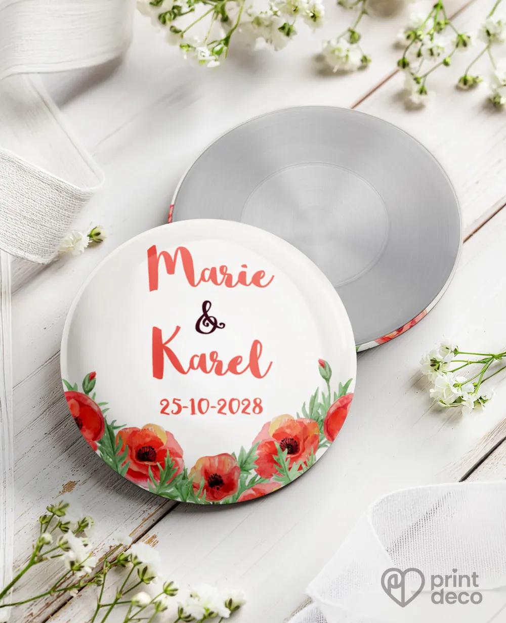 Svatební mini nálepky na obálky a dárky s romantickým motivem červených máků dodají vašim tiskovinám svěží a energický vzhled. Výrazné květy s jemnými lístky v kontrastu se zelenou trávou vyniknou na obálkách oznámení i drobných dárkových krabičkách. Personalizaci jmen a data si jednoduše upravíte zdarma přes online editor přesně podle svých představ. Nálepky jsou kulaté, dostupné v různých velikostech, takže je využijete na obálky, výslužky i malé pozornosti pro hosty. Kvalitní tisk, rychlá výroba a možnost sladit je s vložkami do obálek, etiketami, magnetkami, jmenovkami a svatebním menu zajistí dokonalou barevnou harmonii vaší svatby.