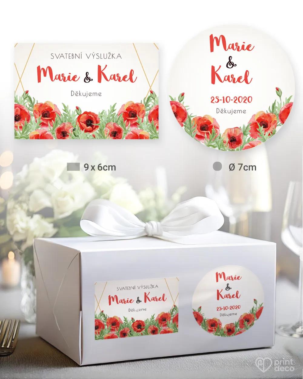 Kulaté svatební nálepky na obálky a dárky s výrazným motivem červených máků a svěžích zelených listů. Různé velikosti, úprava zdarma v online editoru podle přání.