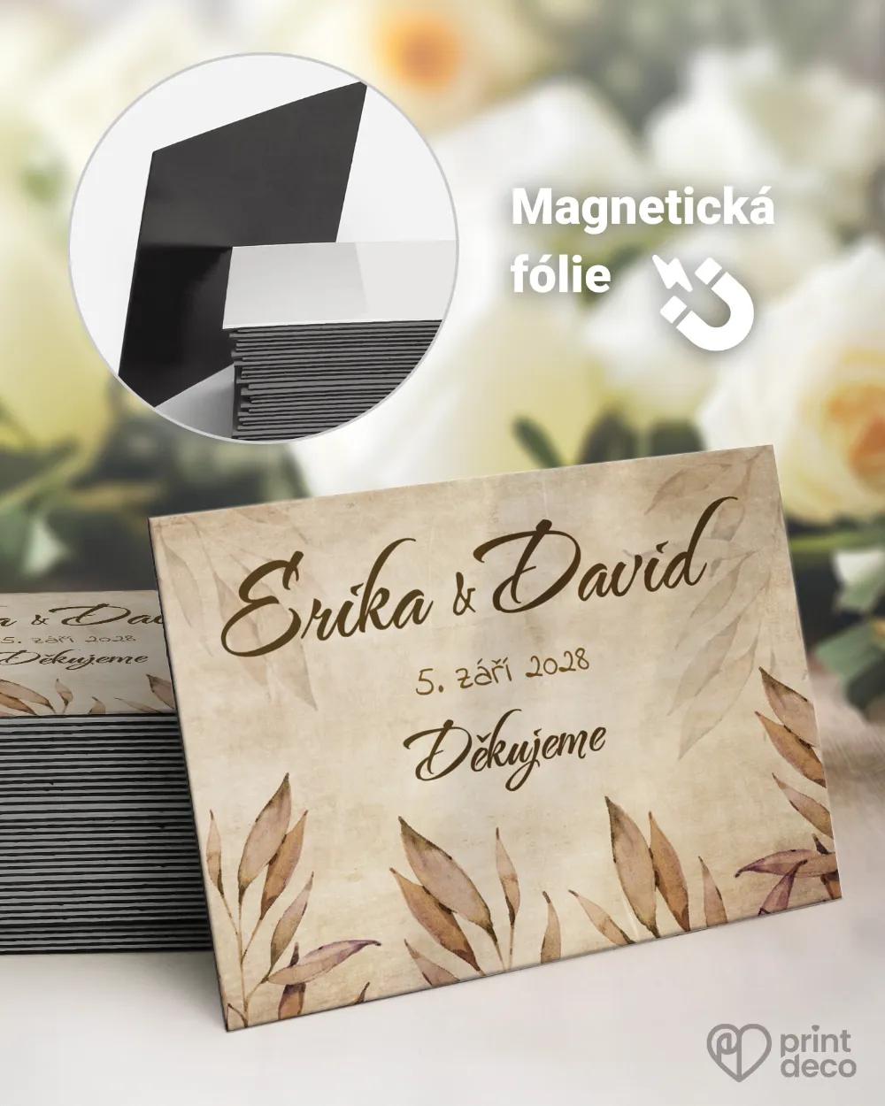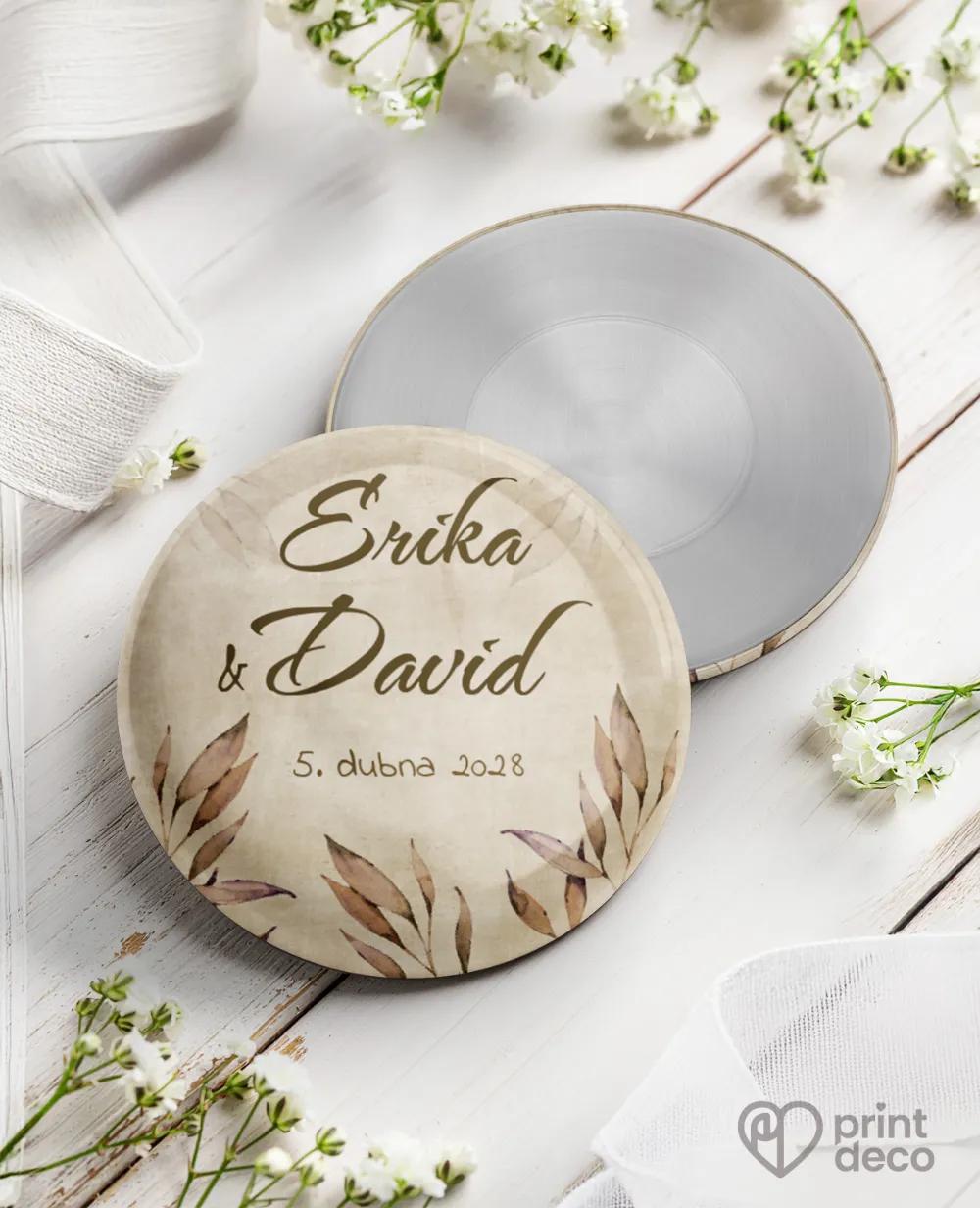 Stylové svatební kulaté nálepky s vintage vzhledem a decentním květinovým motivem jsou krásným doplňkem k vašim svatebním výslužkám či dárkům pro hosty. Jejich jemné zemité barvy a elegantní typografie skvěle doplní rustikální, retro nebo bohémské svatby. Díky online editoru si jména a datum upravíte zdarma podle přání. Nálepky můžete sladit i s dalšími tiskovinami ve stejném stylu — jmenovkami, magnetkami, etiketami či svatebním menu. Kvalitní tisk, rychlá výroba a originální design jsou zárukou spokojenosti.