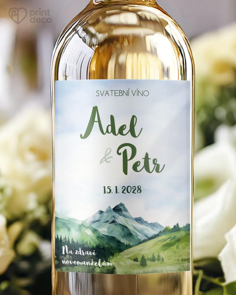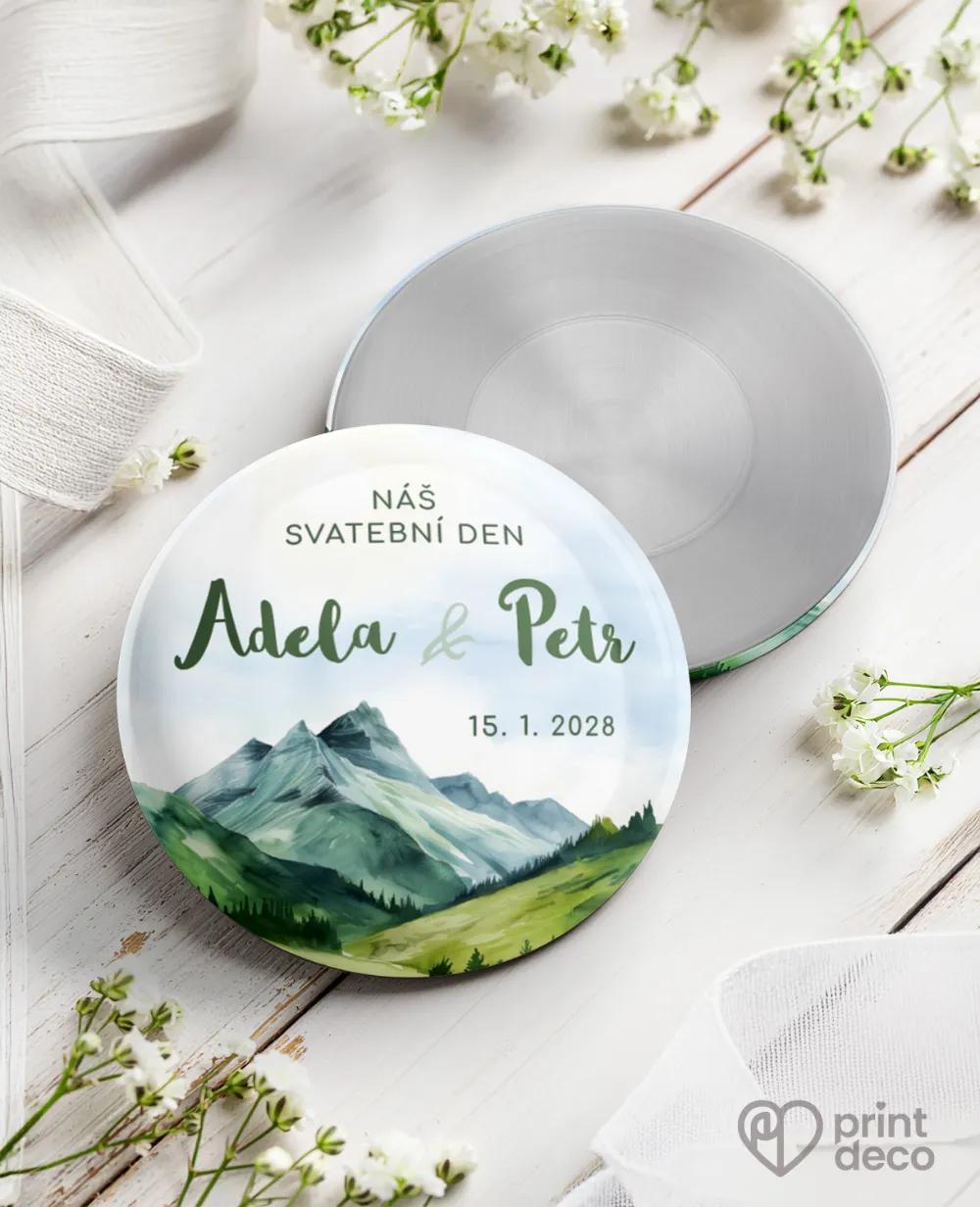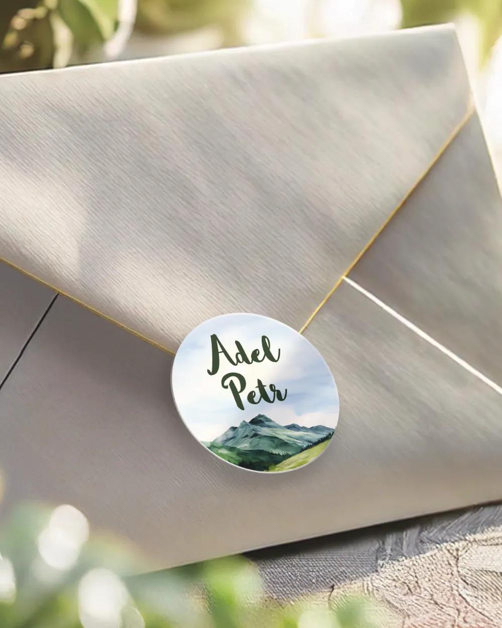 Svatební samolepky s horským motivem v modrozelené paletě, kulaté i obdélníkové, na výslužky a krabičky, s personalizací a úpravou zdarma přes online editor.