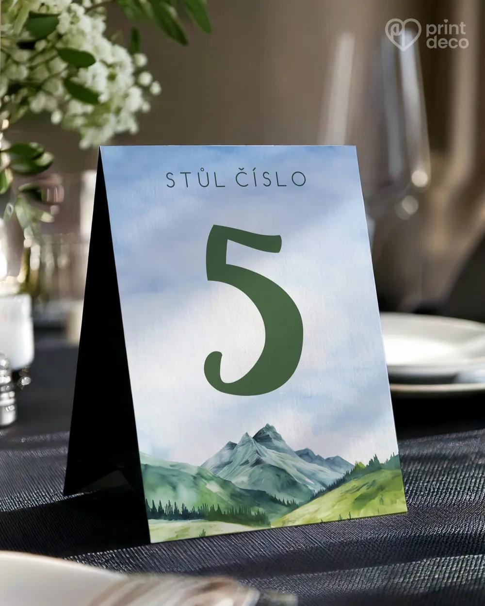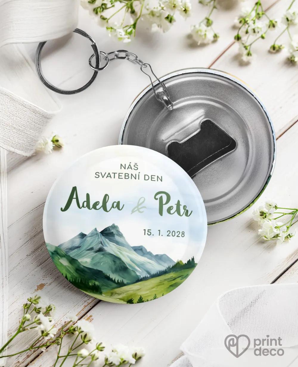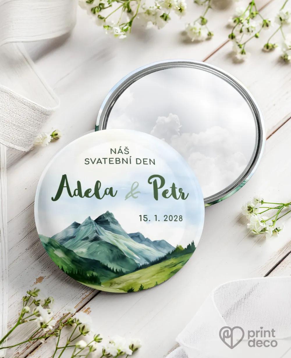 Svatební samolepky s horským motivem v modrozelené paletě, kulaté i obdélníkové, na výslužky a krabičky, s personalizací a úpravou zdarma přes online editor.