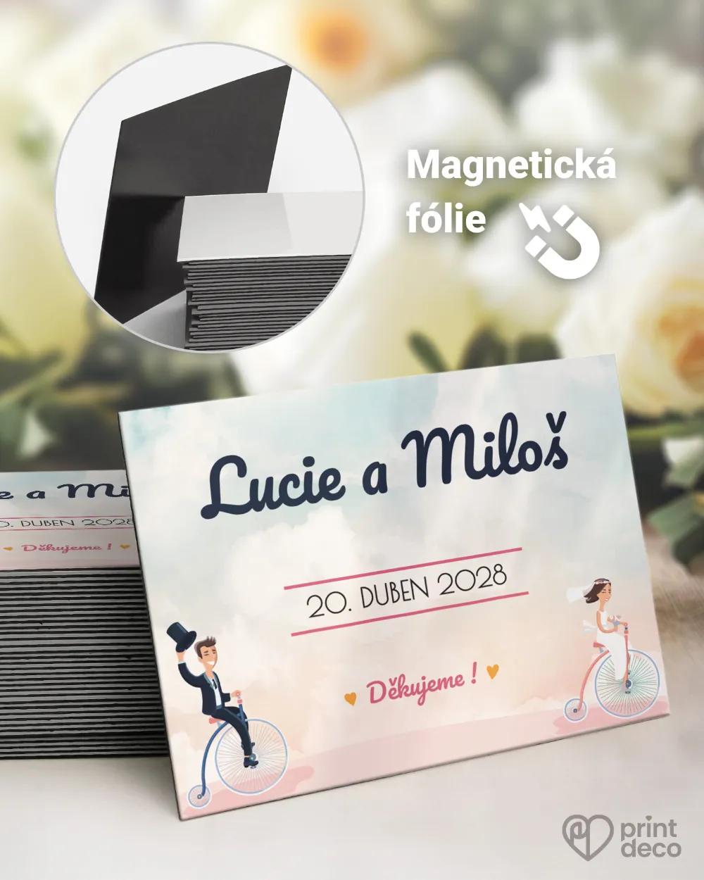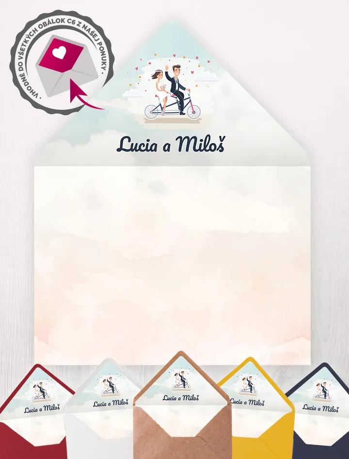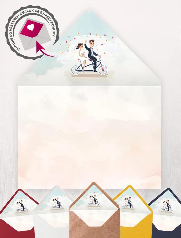 Svatební samolepky na výslužky s motivem zamilovaného páru na kolech, kulaté i obdélníkové, personalizace zdarma přes online editor, vhodné na krabičky.