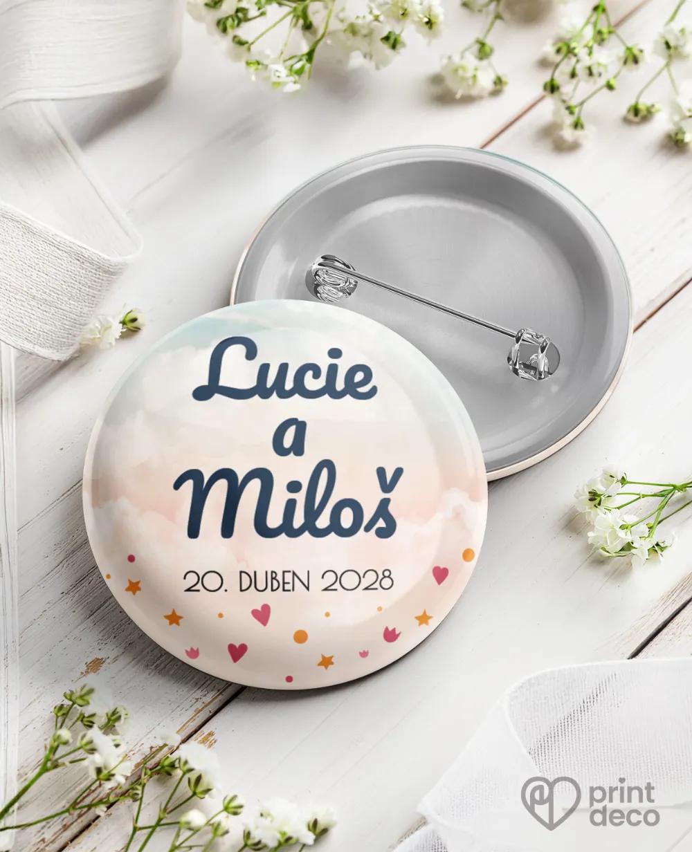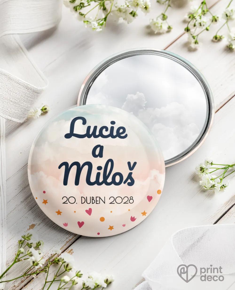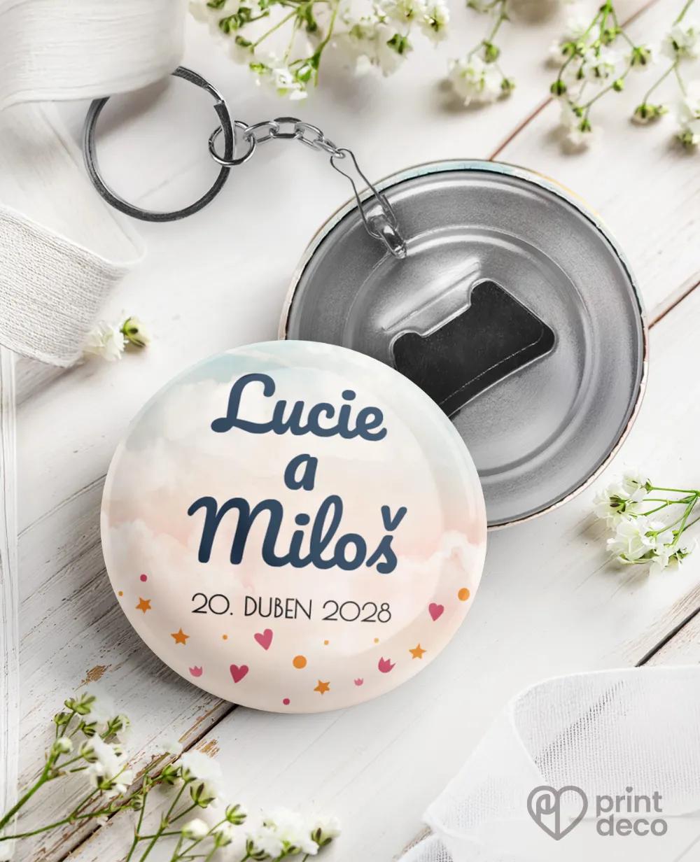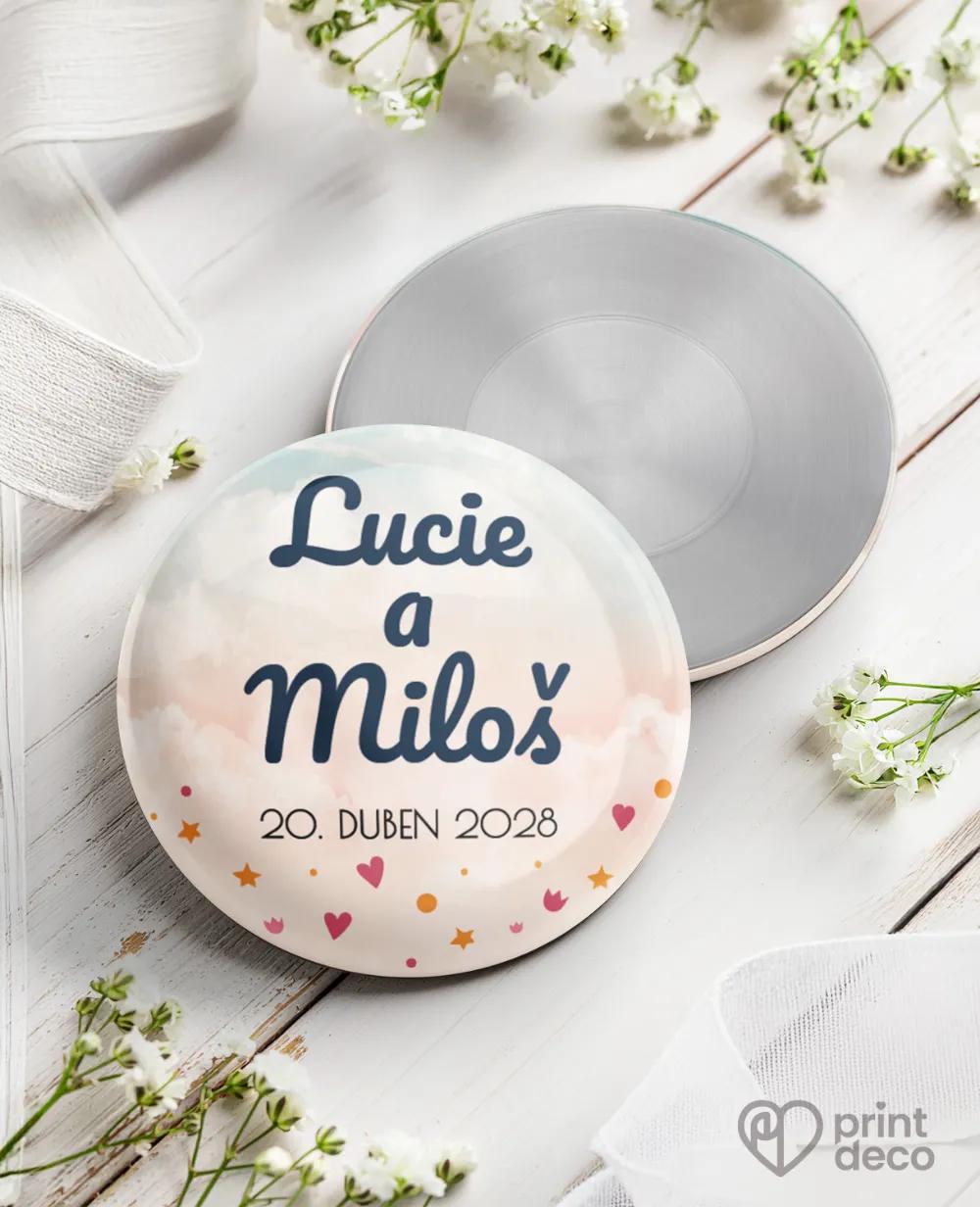 Svatební samolepky na výslužky s veselým motivem zamilovaného páru na starodávných kolech dodají vašim dárkům pro hosty hravý a romantický vzhled. Jemné pastelové pozadí s drobnými hvězdičkami a srdíčky dotváří svěží a láskyplnou atmosféru. Samolepky jsou personalizované jmény a datem svatby, které si jednoduše upravíte přes online editor zdarma podle svých představ. K dispozici jsou v kulatém i obdélníkovém tvaru a hodí se na svatební výslužky, krabičky i malé dárky. Ve stejném designu můžete sladit i další svatební tiskoviny – etikety na láhve, magnetky, jmenovky, menu a další – a vytvořit tak jednotný a originální svatební set.