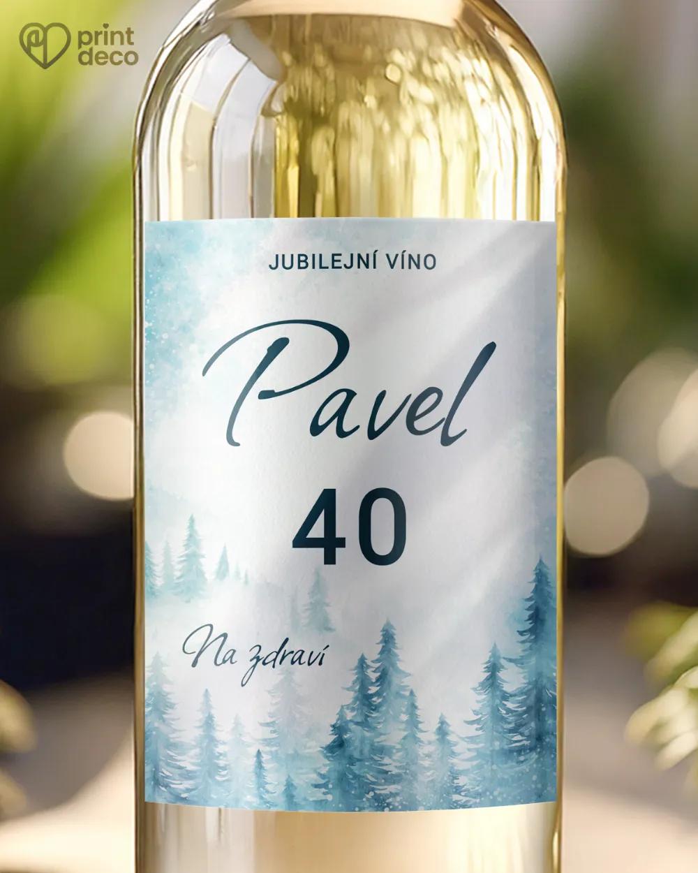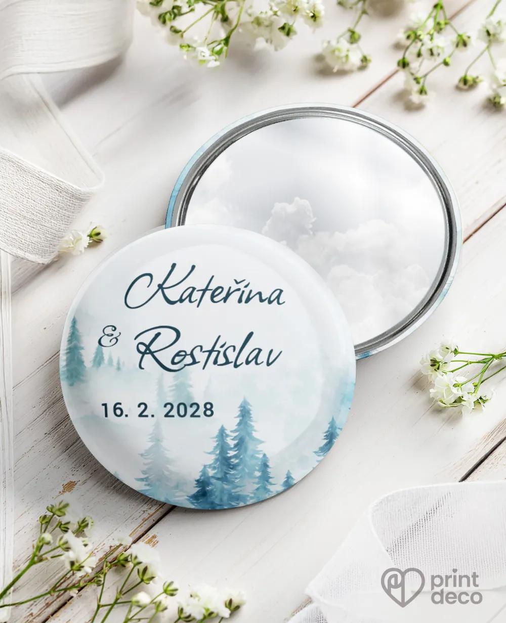 Svatební samolepky na výslužky se zimním motivem borovicového lesa, kulaté i obdélníkové, úprava zdarma přes online editor, vhodné na svatební krabičky a dárky