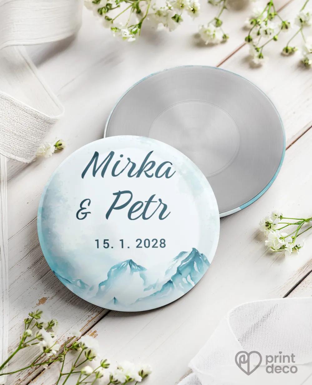Svatební samolepky na výslužky se zimním motivem zasněžených hor, kulaté i obdélníkové, úprava zdarma přes online editor, ideální na výslužky a svatební krabičky.