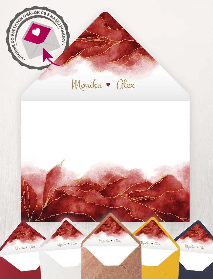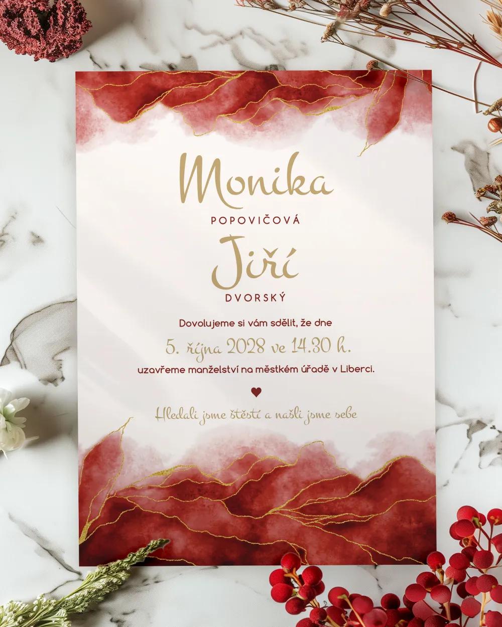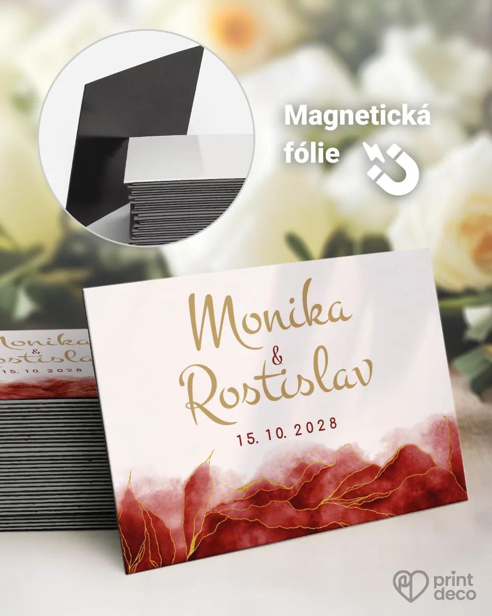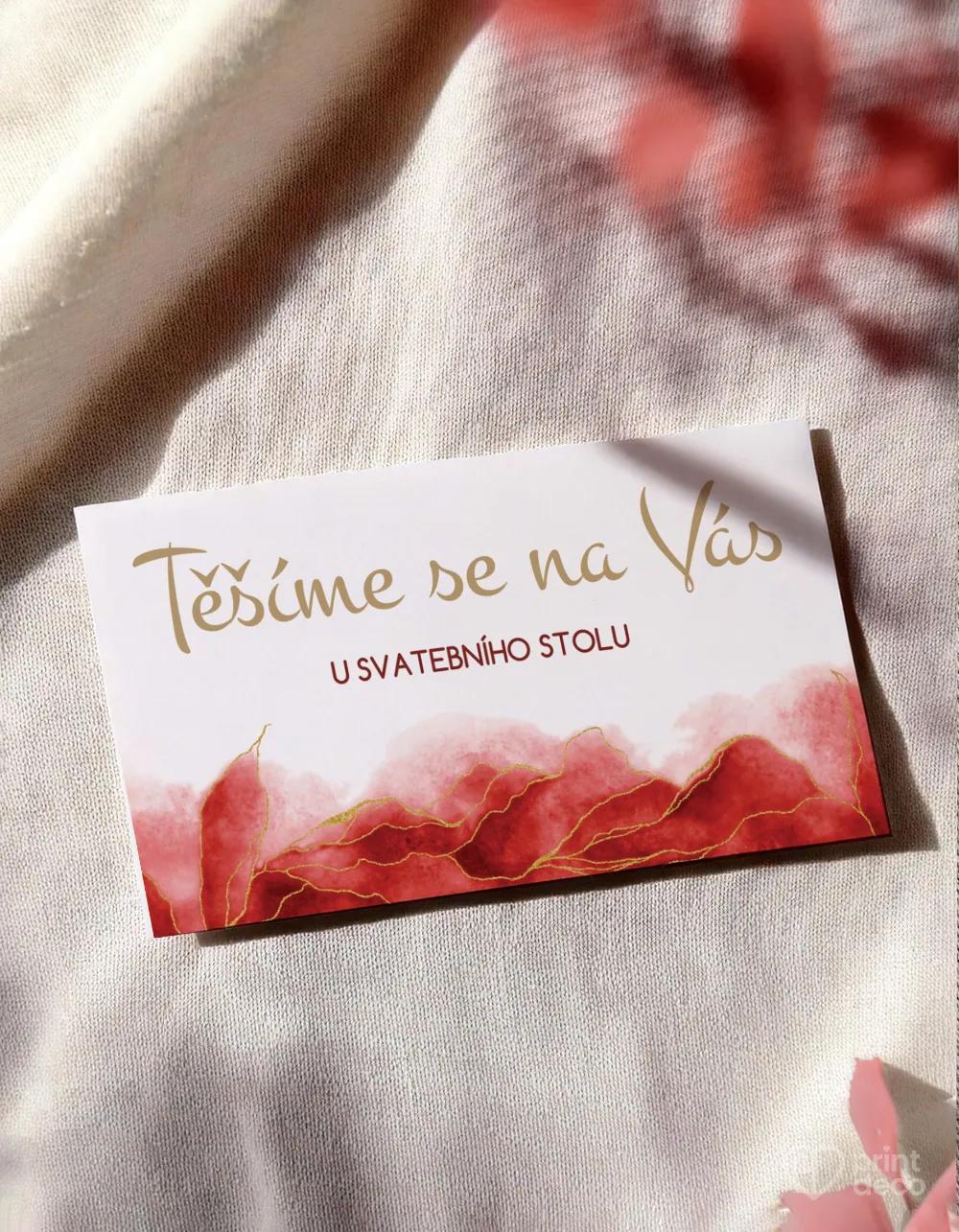 Číslování stolů je praktickým a zároveň velmi dekorativním prvkem svatební výzdoby, který usnadňuje hostům orientaci a dodává stolům slavnostní vzhled. Tento moderní design s abstraktními bordó tvary protkán jemnými zlatými liniemi se hodí na elegantní, luxusní i podzimní svatby. Můžete si vybrat mezi jednostrannou verzí vhodnou do rámečku a oboustrannou přehnutou do stříšky, která stojí samostatně na stole. Kvalitní tisk, rychlá výroba a možnost sladit číslování s jmenovkami, etikety, magnetkami či menu zajistí, že vaše svatební výzdoba bude dokonale sladěná.