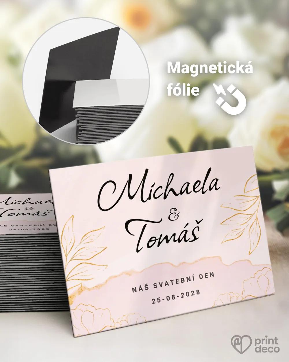Číslování stolů je nenahraditelným prvkem každé svatby, který zpříjemní hostům orientaci a zároveň vkusně doplní výzdobu stolů. Můžete si zvolit jednostrannou verzi určenou do rámečku nebo praktickou oboustrannou, přehnutou do stříšky, která stojí samostatně. Tento motiv se nese v duchu jemné elegance – růžové mramorové pozadí zdobí zlaté květinové linie s decentními detaily. Ideálně zapadne k romantickým, moderním i glamour svatbám. Kromě své funkčnosti je také krásným estetickým doplňkem. Vysoká kvalita tisku, expresní výroba a možnost sladit s dalšími svatebními tiskovinami jako jmenovky, etikety, magnetky či menu zajistí dokonalou harmonii vaší výzdoby.