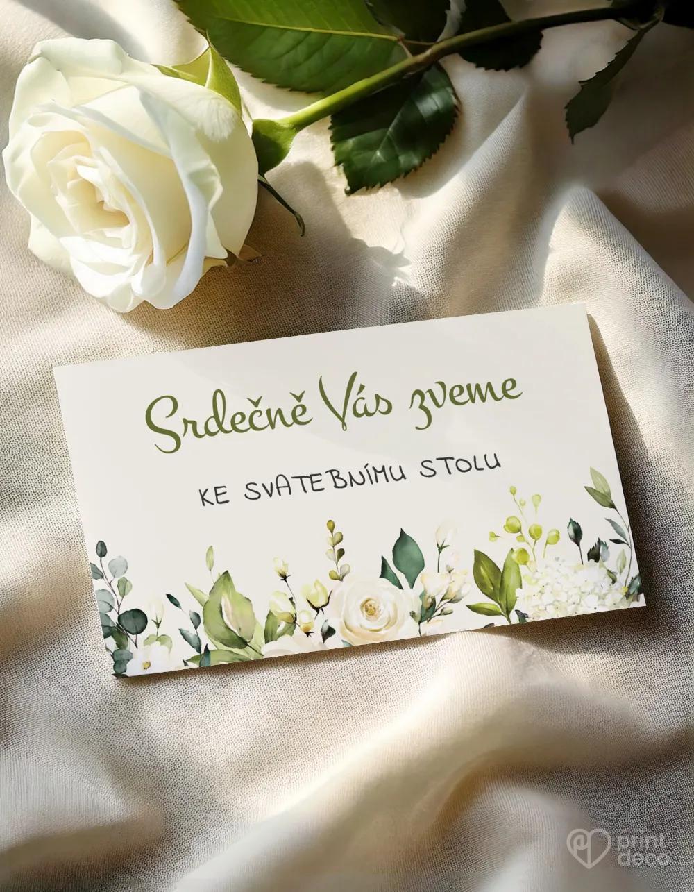 Svatební číslování stolů s motivem bílých růží a jemných zelených lístků, vhodné k romantické i elegantní výzdobě, v jednostranné verzi do rámečku či oboustranné přehnuté do stříšky.