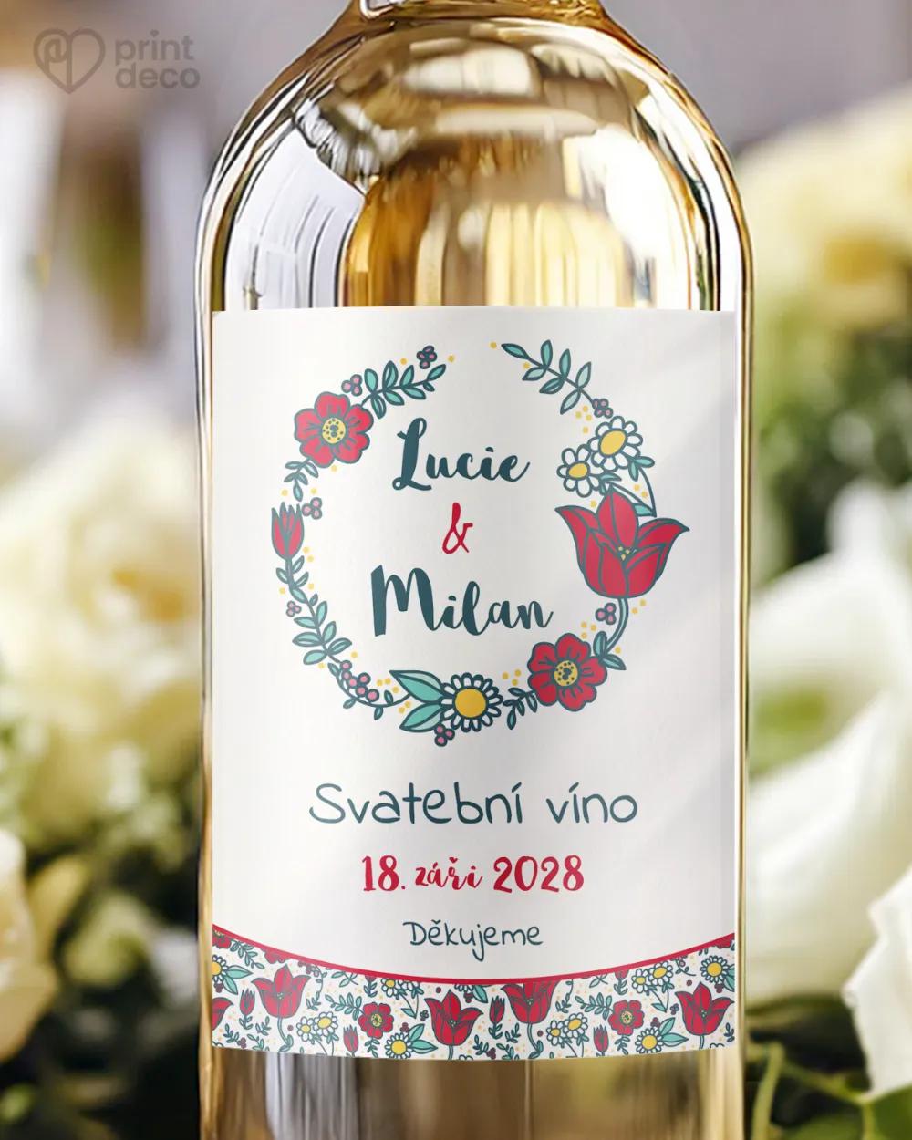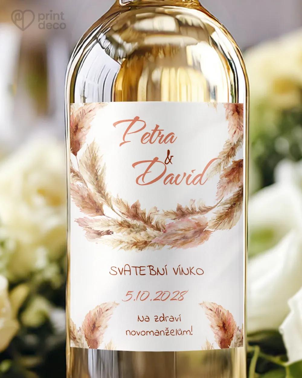 Moderní svatební etiketa na víno v elegantním stylu s abstraktním mramorovým motivem v jemných růžových tónech a zlatými květinovými detaily. Tento design krásně doplní svatební výslužky i stolování a hodí se zejména na elegantní a luxusně laděné svatby. Text na etiketě si můžete upravit online zdarma, výroba je expresní a etiketu snadno sladíte i s dalšími tiskovinami ve stejném stylu.