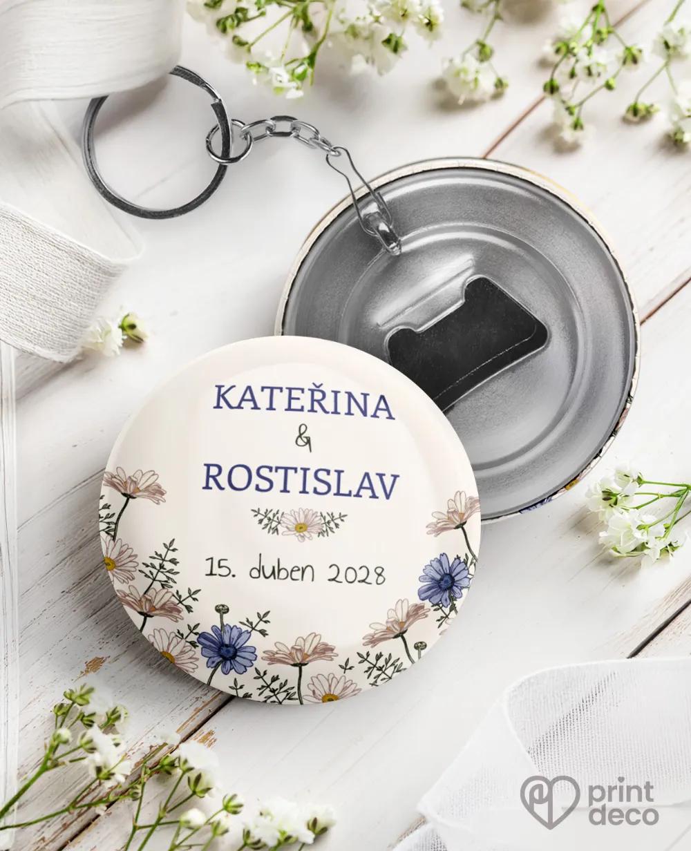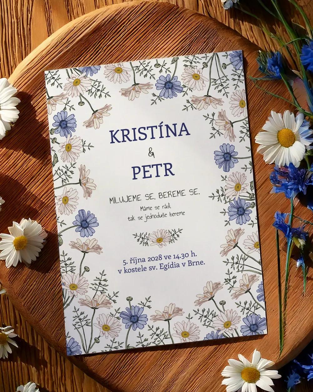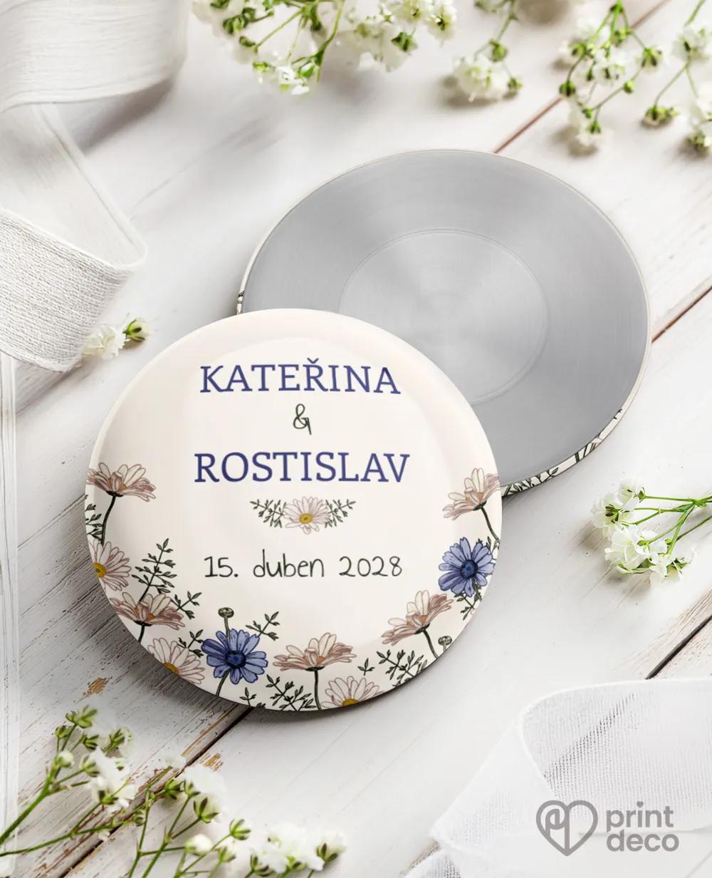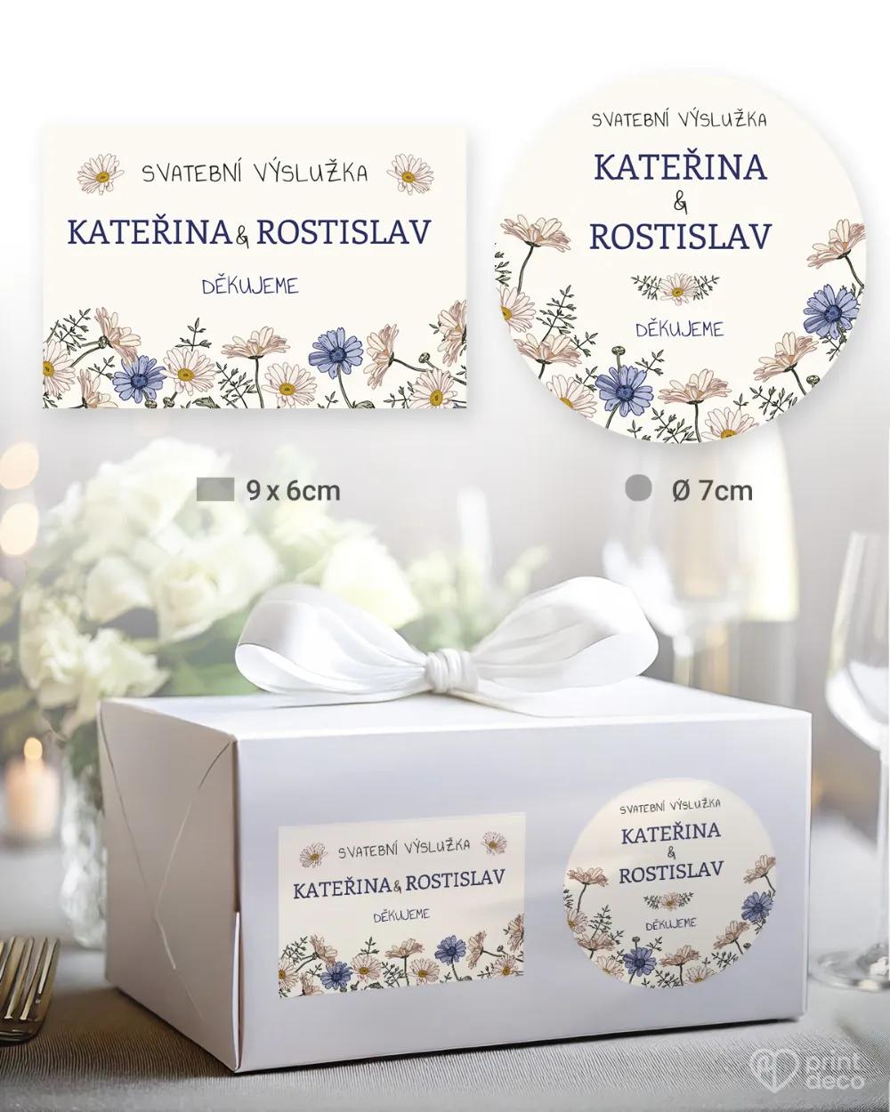 Romantická svatební etiketa na víno s něžným motivem kopretin a modrých lučních květů dodá výslužkovým lahvím přírodní a jemný šarm. Vhodná pro svatby v rustikálním, vintage i přírodním stylu. Text si upravíte online zdarma, etikety vyrobíme expresně a spolehlivě. Skvělý detail na stůl i jako dárek pro hosty.