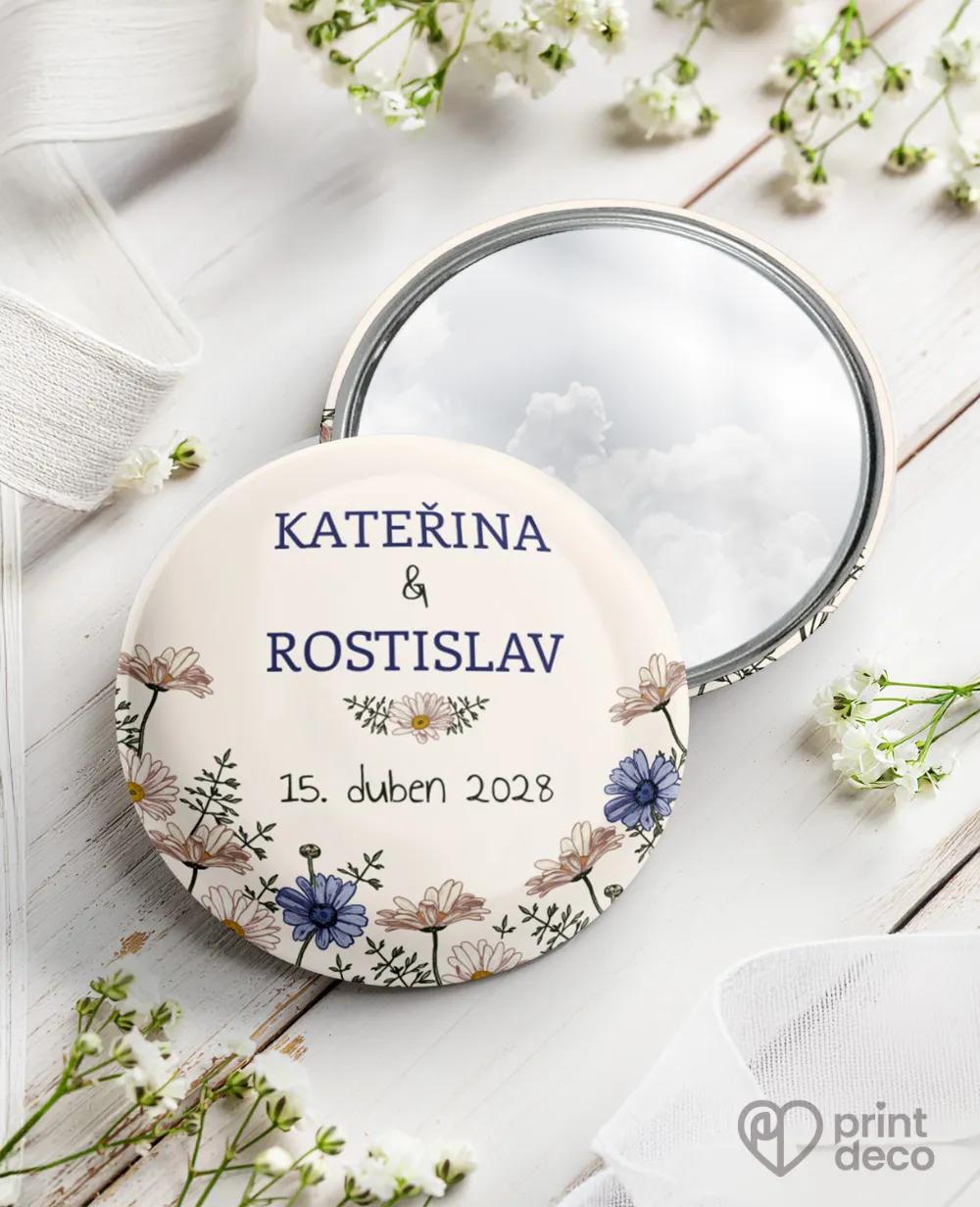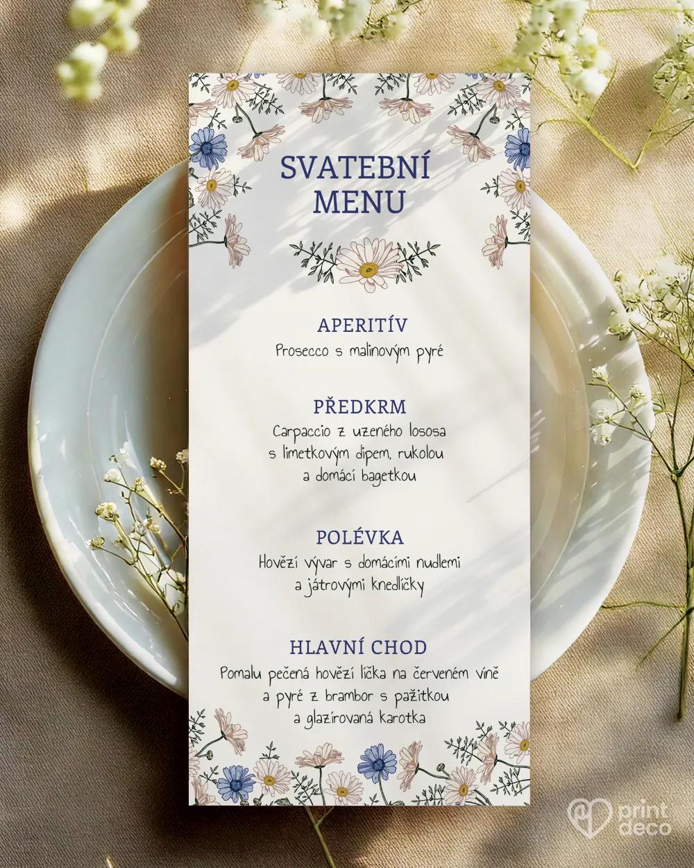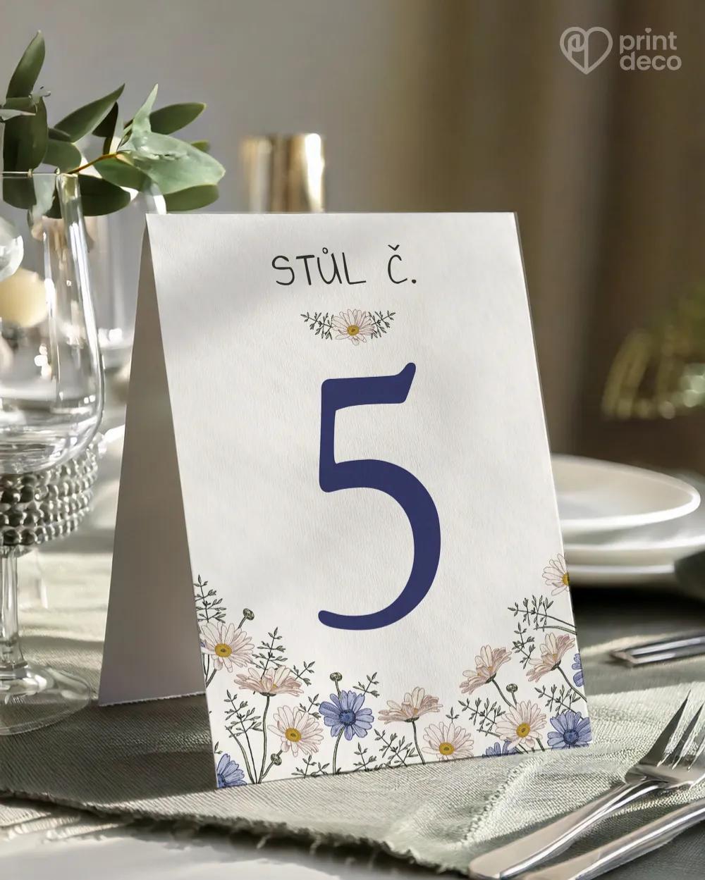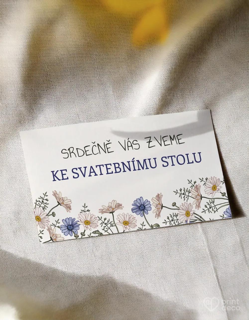 Romantická svatební etiketa na víno s něžným motivem kopretin a modrých lučních květů dodá výslužkovým lahvím přírodní a jemný šarm. Vhodná pro svatby v rustikálním, vintage i přírodním stylu. Text si upravíte online zdarma, etikety vyrobíme expresně a spolehlivě. Skvělý detail na stůl i jako dárek pro hosty.