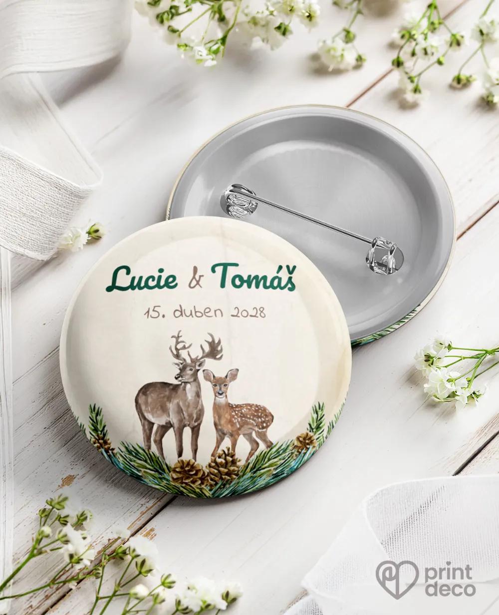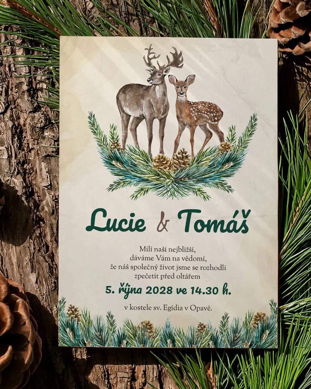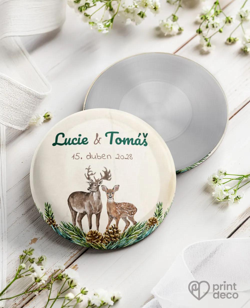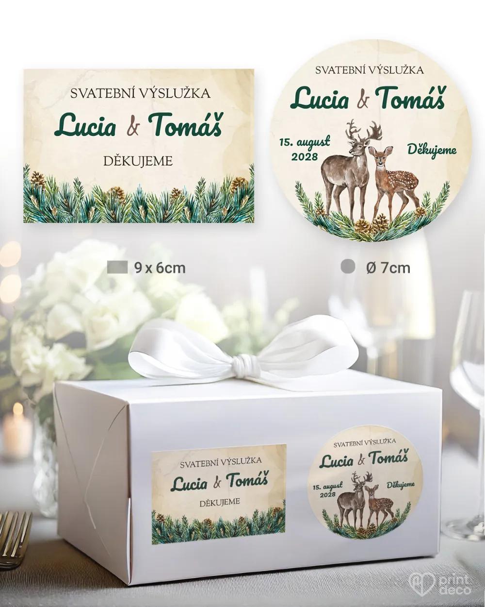 Stylová svatební etiketa na víno s originálním loveckým motivem jelena a laně mezi šiškami a chvojím. Dokonalá volba pro milovníky přírody a lesů, etiketa krásně dotvoří atmosféru svatebního stolu i výslužkových lahví. Text upravíte online zdarma a etikety vyrobíme expresně a ve vysoké kvalitě. Vhodné také jako poděkování pro hosty.