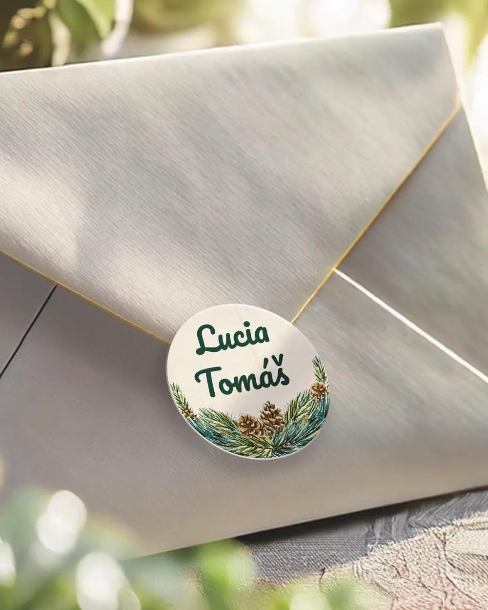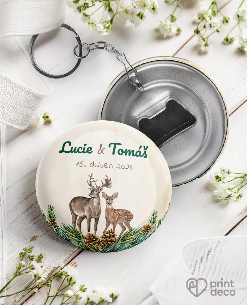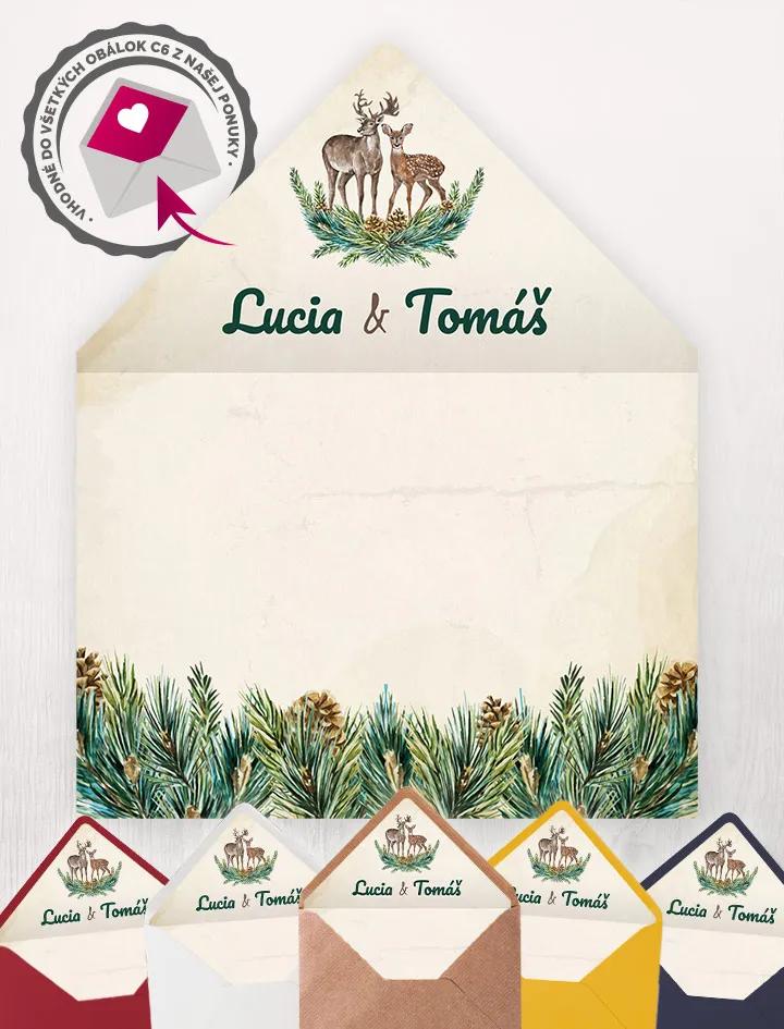 Stylová svatební etiketa na víno s originálním loveckým motivem jelena a laně mezi šiškami a chvojím. Dokonalá volba pro milovníky přírody a lesů, etiketa krásně dotvoří atmosféru svatebního stolu i výslužkových lahví. Text upravíte online zdarma a etikety vyrobíme expresně a ve vysoké kvalitě. Vhodné také jako poděkování pro hosty.