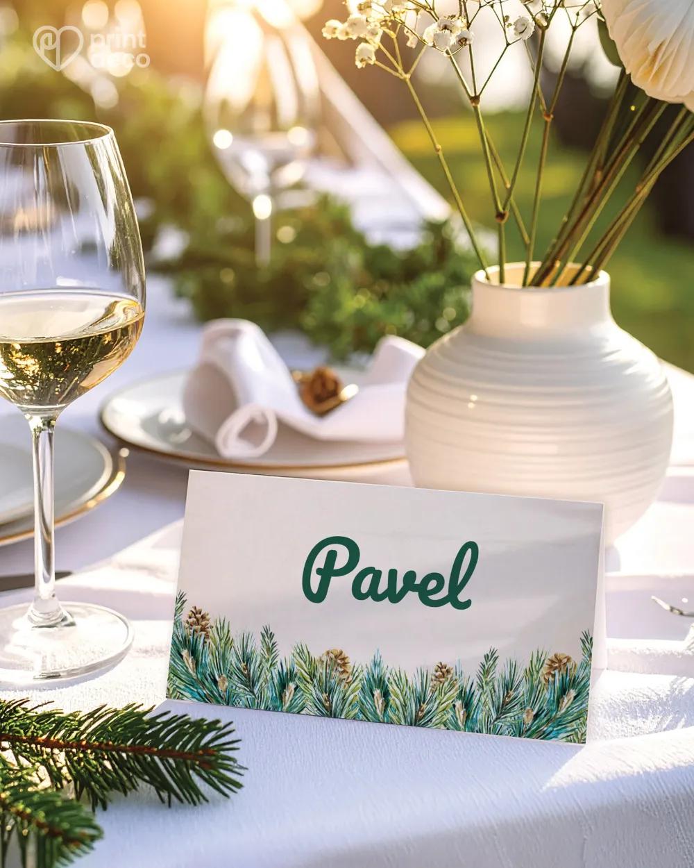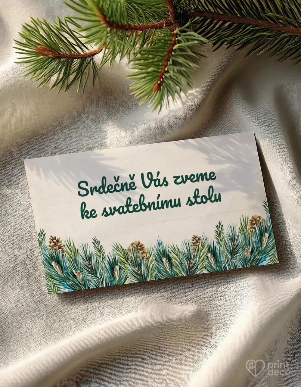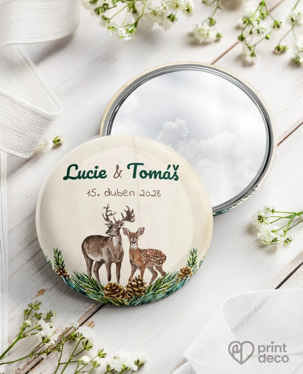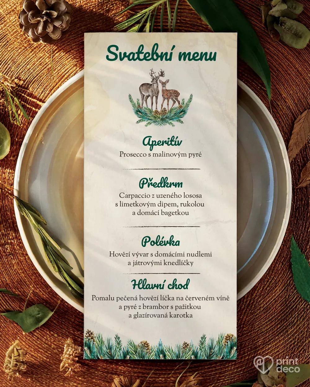 Stylová svatební etiketa na víno s originálním loveckým motivem jelena a laně mezi šiškami a chvojím. Dokonalá volba pro milovníky přírody a lesů, etiketa krásně dotvoří atmosféru svatebního stolu i výslužkových lahví. Text upravíte online zdarma a etikety vyrobíme expresně a ve vysoké kvalitě. Vhodné také jako poděkování pro hosty.