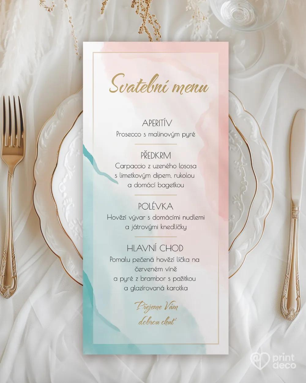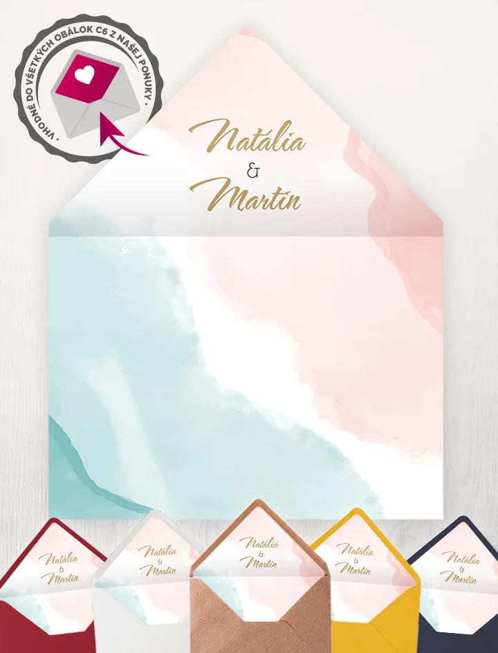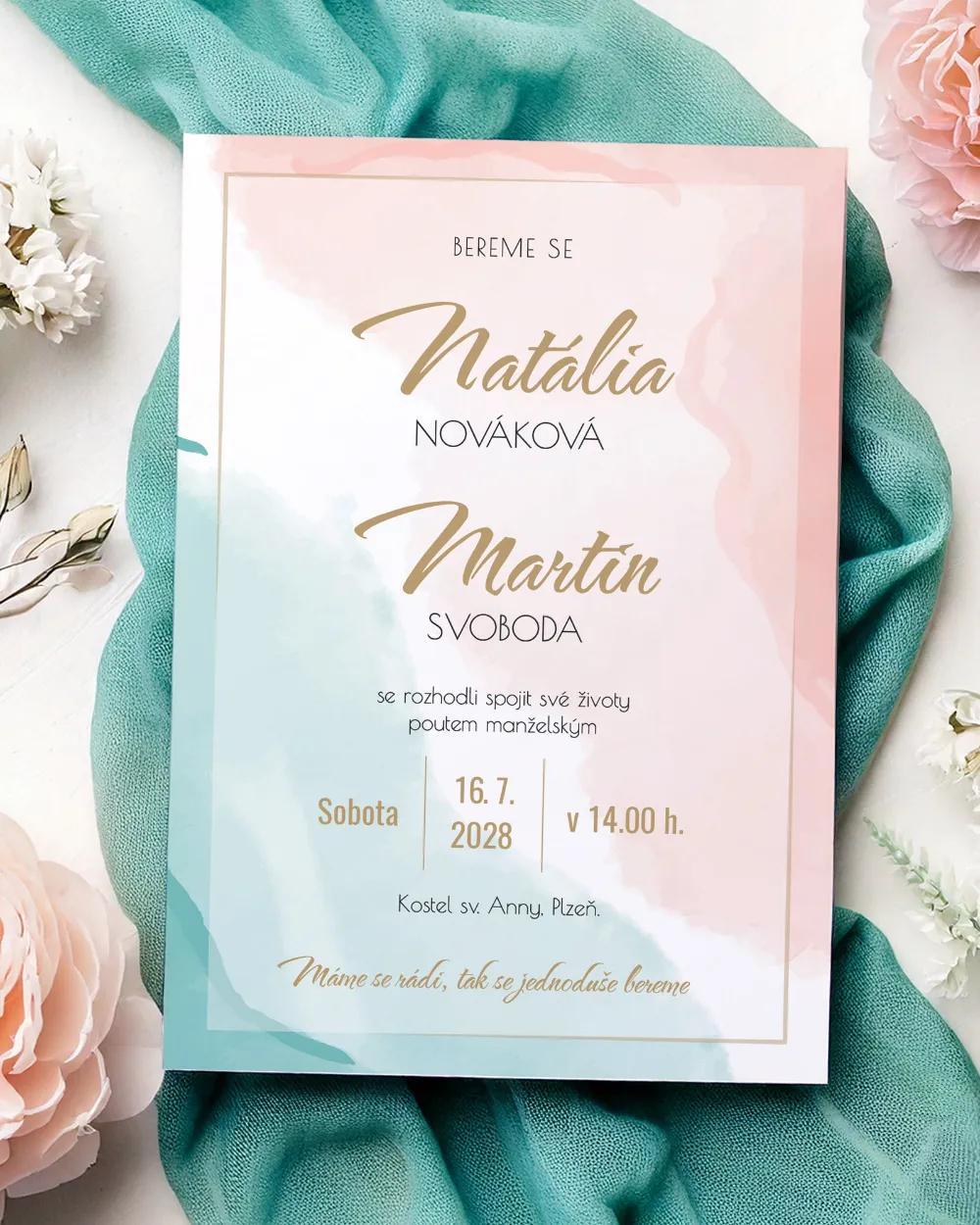Svatební jmenovka na stůl s moderním abstraktním motivem v pastelových tónech. Úprava jmen zdarma přes online editor, expresní výroba a kvalitní tisk.