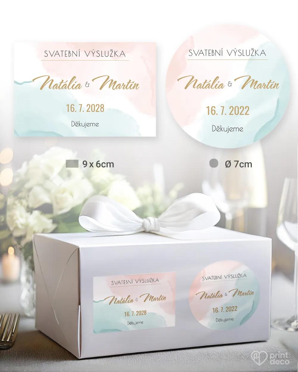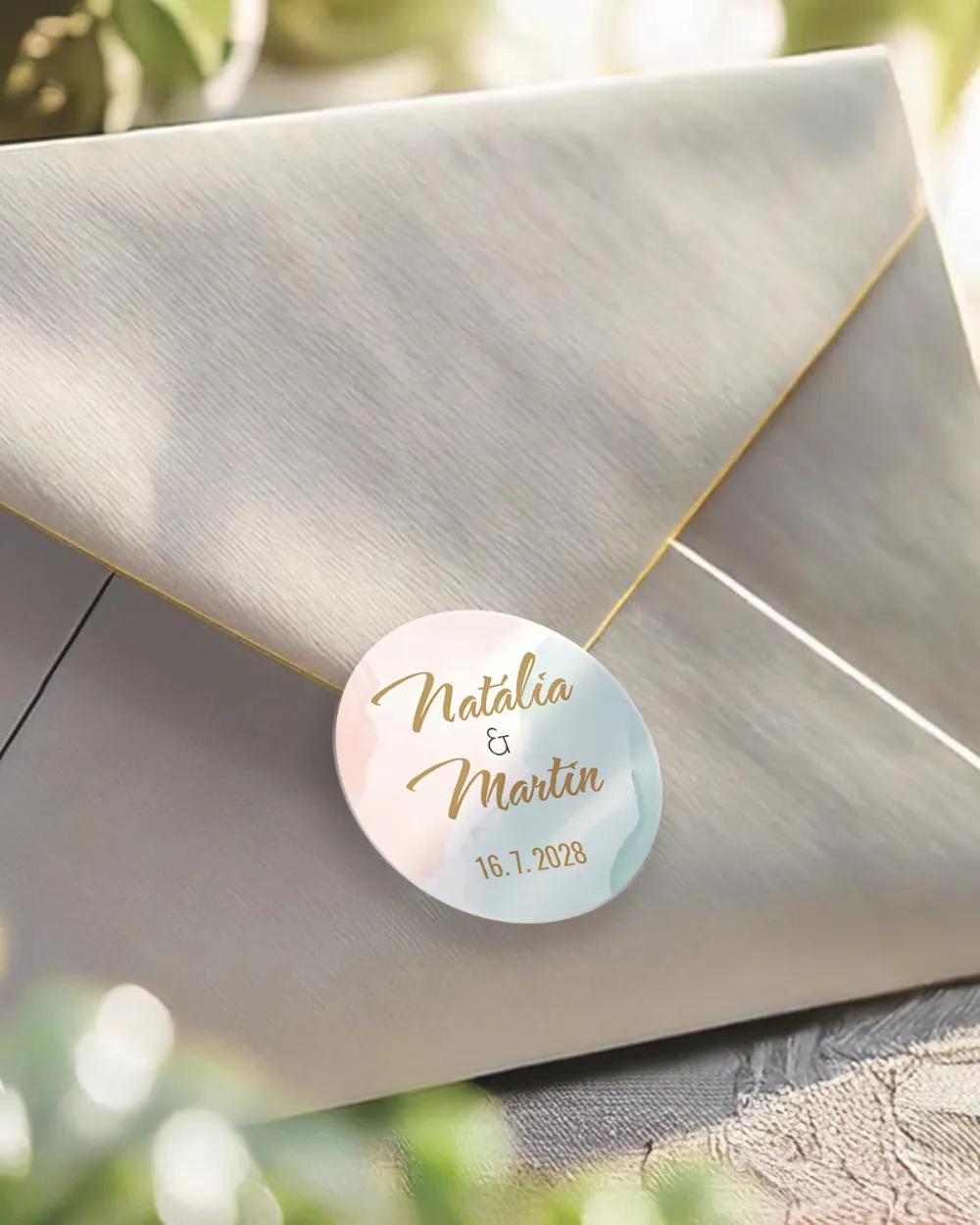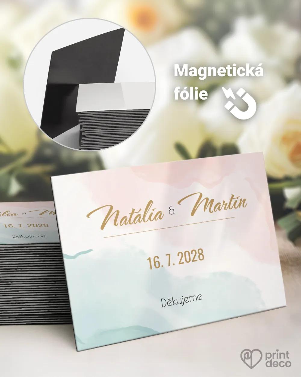 Svatební jmenovka na stůl s moderním abstraktním motivem v pastelových tónech. Úprava jmen zdarma přes online editor, expresní výroba a kvalitní tisk.