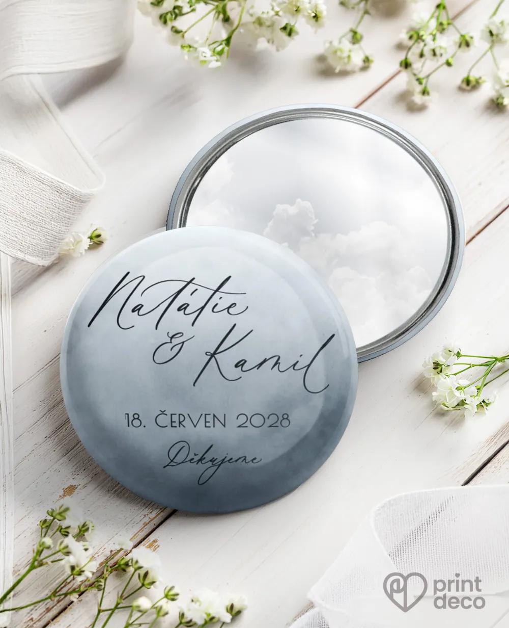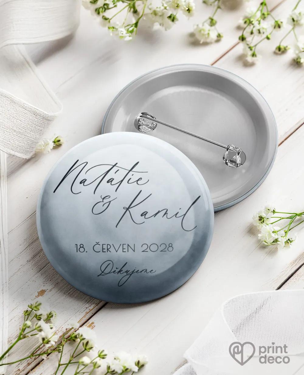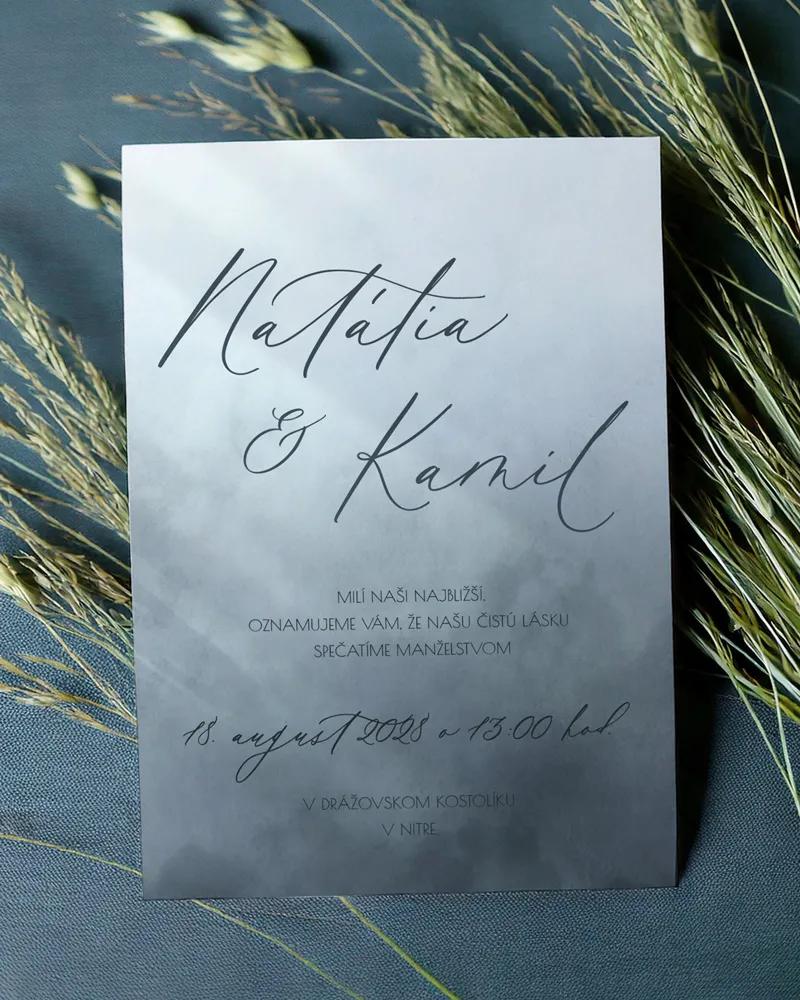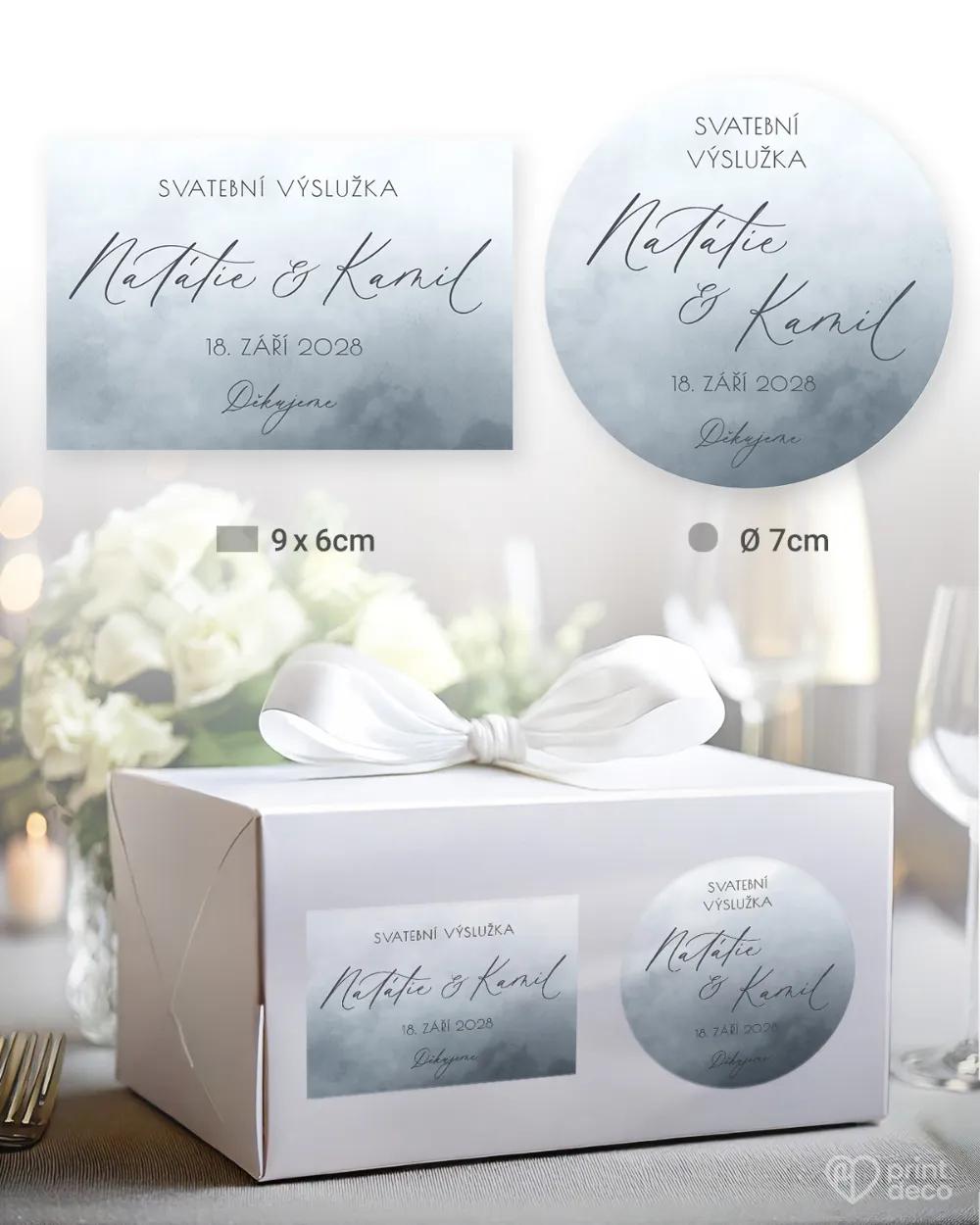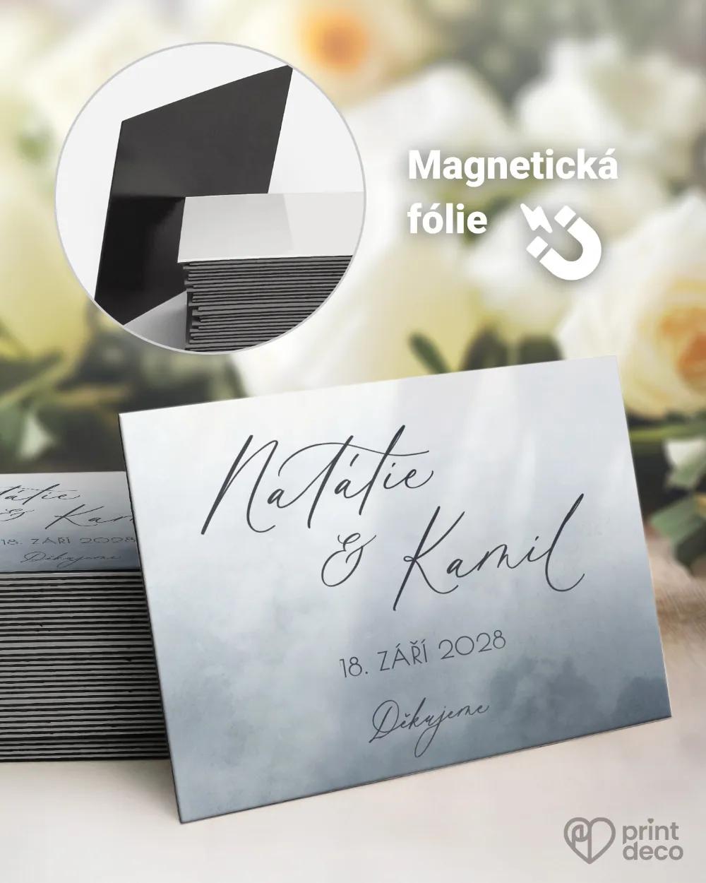 Svatební jmenovky na stůl se šedo-modrým akvarelovým pozadím dodají hostině jemnost a eleganci. Úprava jmen zdarma, expresní tisk a prémiové zpracování.