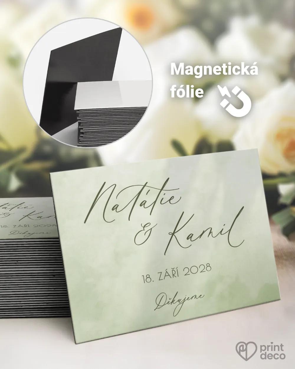 Svatební jmenovky na stůl v tmavě zelené, tzv. lahvové barvě působí mimořádně elegantně a luxusně. Tento hluboký odstín s akvarelovým efektem je ideální pro svatby s důrazem na noblesu, přírodní harmonii a moderní styl. Jmenovky s kaligrafickým písmem jsou praktické a zároveň působí jako estetický doplněk svatebního stolování. Jména hostů si jednoduše přizpůsobíte přes online editor zdarma nebo nám zašlete seznam ke zpracování. Motiv lze krásně kombinovat s dalšími tiskovinami ve stejném designu – oznámeními, etiketami na láhve či samolepkami. Díky expresní výrobě a špičkové kvalitě tisku budete mít jistotu, že jmenovky budou připravené včas a ve výjimečné kvalitě.