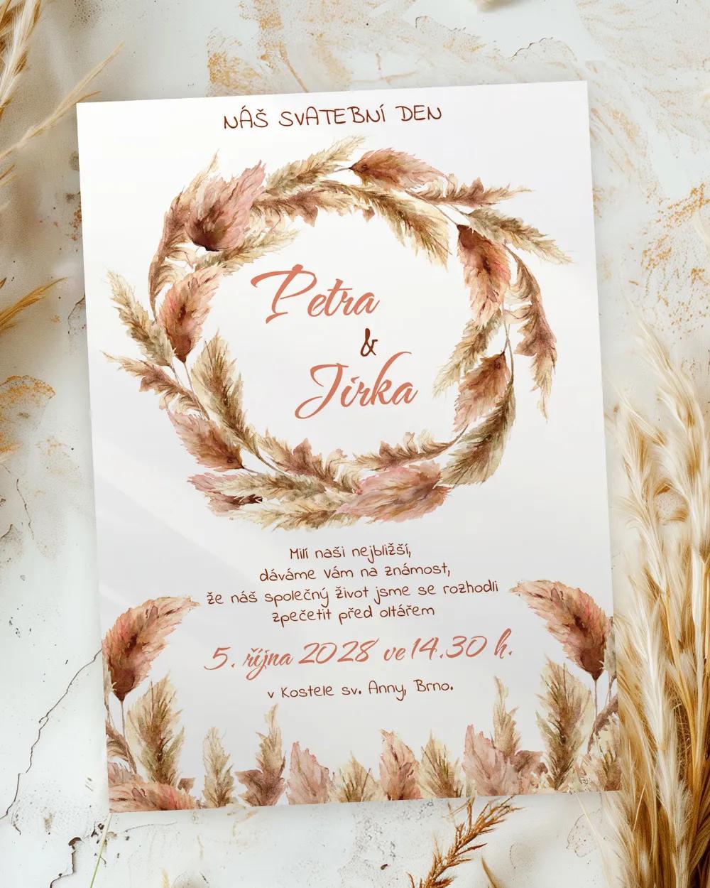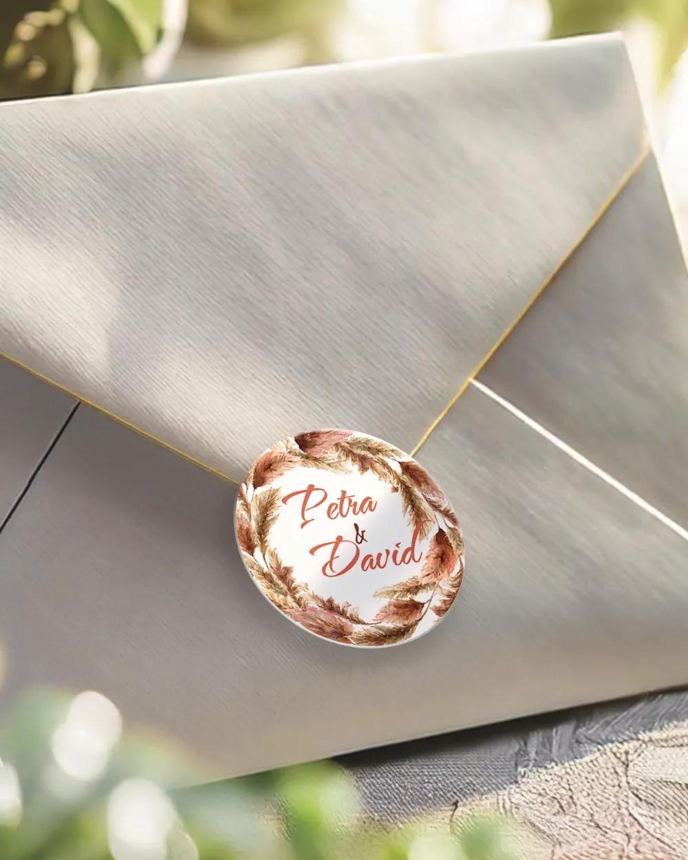 Svatební jmenovky na stůl jsou praktickým i dekorativním detailem, který hostům usnadní nalezení místa a zároveň ozdobí svatební hostinu. Motiv béžových trav a listů působí jemně a přirozeně – akvarelový věnec v odstínech béžové a hnědé vytváří harmonický a elegantní dojem. Tento design je ideální pro rustikální, boho či podzimní svatby, kde hrají přírodní prvky důležitou roli. Objednávka je velmi jednoduchá: stačí přidat seznam jmen do online editoru nebo do boxu pro grafika a o zpracování se postaráme vždy zdarma. Jmenovky využijete na svatebním stole, při zasedacím pořádku i jako stylový doplněk k výslužkám. Kvalitní tisk a expresní výroba zajistí dokonalý výsledek, který snadno sladíte s dalšími tiskovinami – od pozvánek přes etikety na láhve až po magnetky či samolepky.