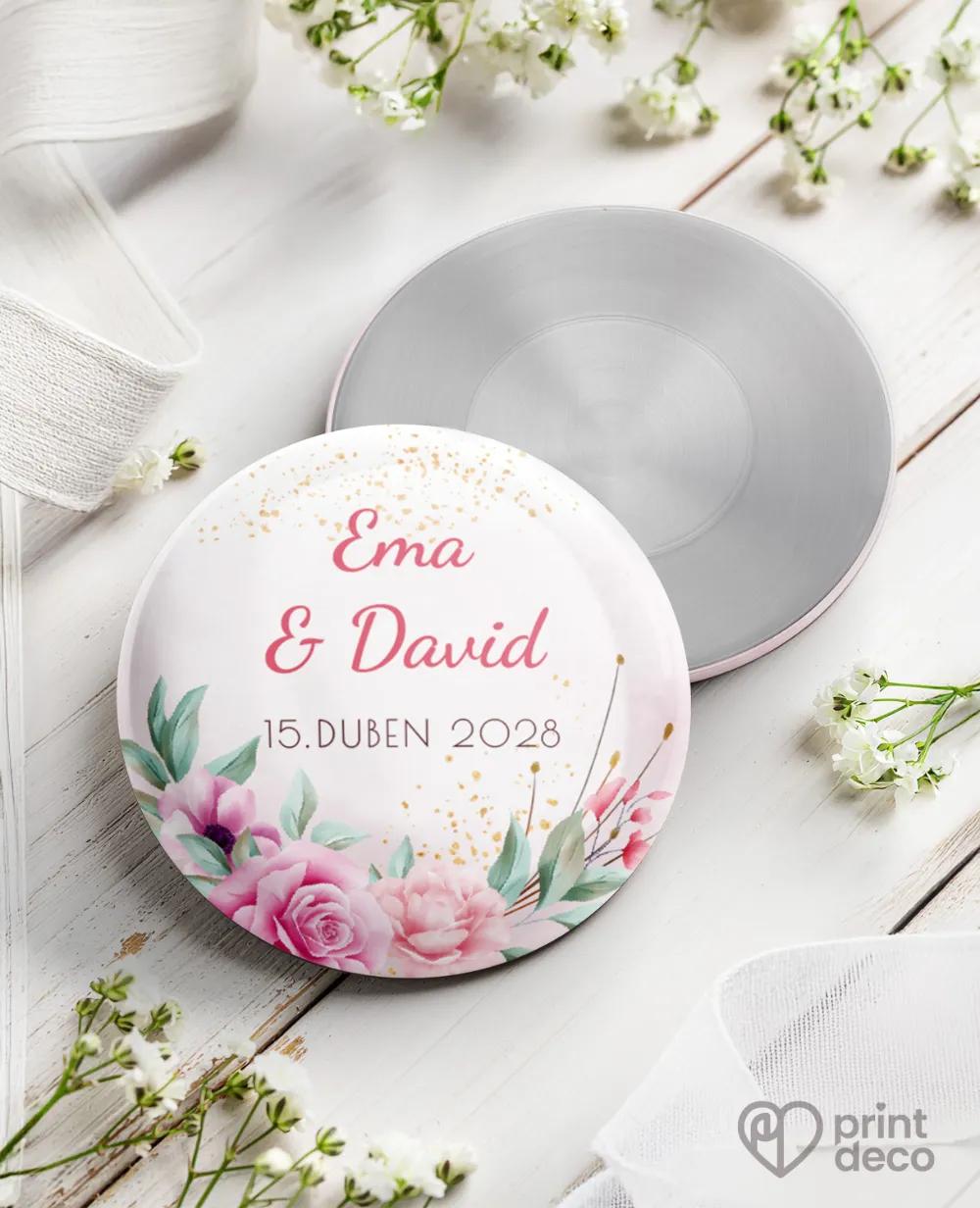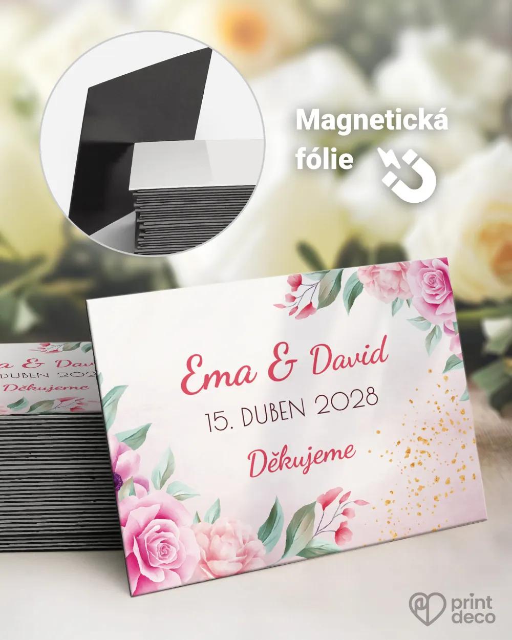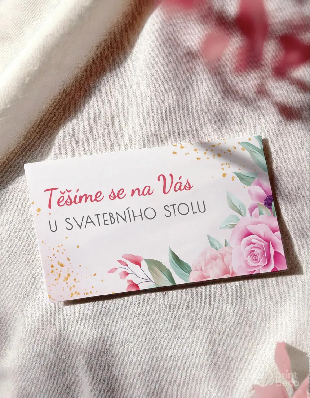 Svatební jmenovky na stůl jsou neodmyslitelným prvkem, který pomůže hostům snadno najít své místo a zároveň dotvoří estetiku svatební hostiny. Motiv šípkových růží působí jemně a romanticky – akvarelové květy v růžových tónech doplňují decentní zlaté tečky, které dodávají designu elegantní a slavnostní nádech. Tento motiv je ideální pro svatby s klasickým, romantickým nebo vintage laděním. Objednávka je jednoduchá: stačí přidat seznam jmen přímo do online editoru nebo vložit text do boxu pro grafika a kompletní zpracování zajistíme vždy zdarma. Jmenovky využijete při usazení hostů na svatebních stolech, v zasedacím pořádku či jako milý detail u výslužek. Vysoce kvalitní tisk a expresní výroba zaručí precizní výsledek, který navíc snadno sladíte s dalšími svatebními tiskovinami ve stejném stylu, jako jsou pozvánky, etikety na lahve, magnetky nebo samolepky.