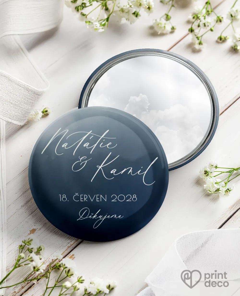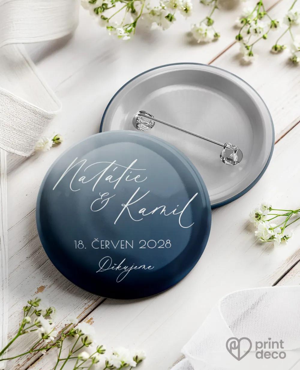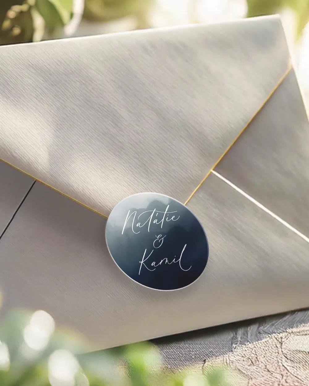 Moderní kruhová kovová svatební magnetka s jemným modrým odstínem a minimalistickým designem je stylová svatební placka a milá památka na váš den. Hosty potěší jako originální dar a osobní suvenýr díky personalizaci jmény a datem svatby. Kovový základ a kvalitní tisk zaručí nadčasový vzhled. Magnetku snadno sladíte s dalšími tiskovinami stejného tónu – jmenovkami, etiketami, menu či samolepkami. Objednejte si je ještě dnes a dolaďte svatební výzdobu do posledního detailu.