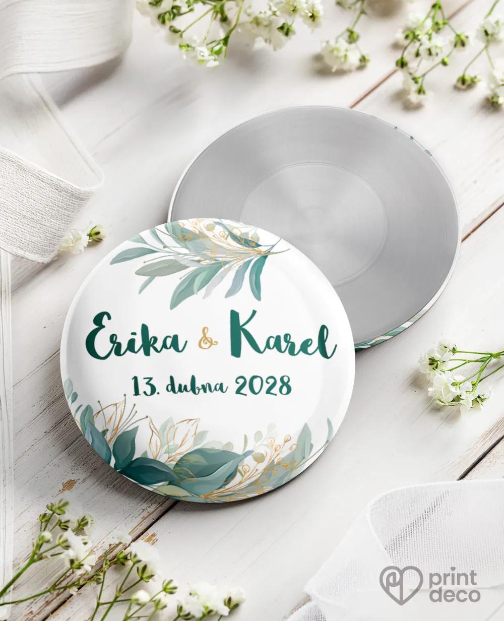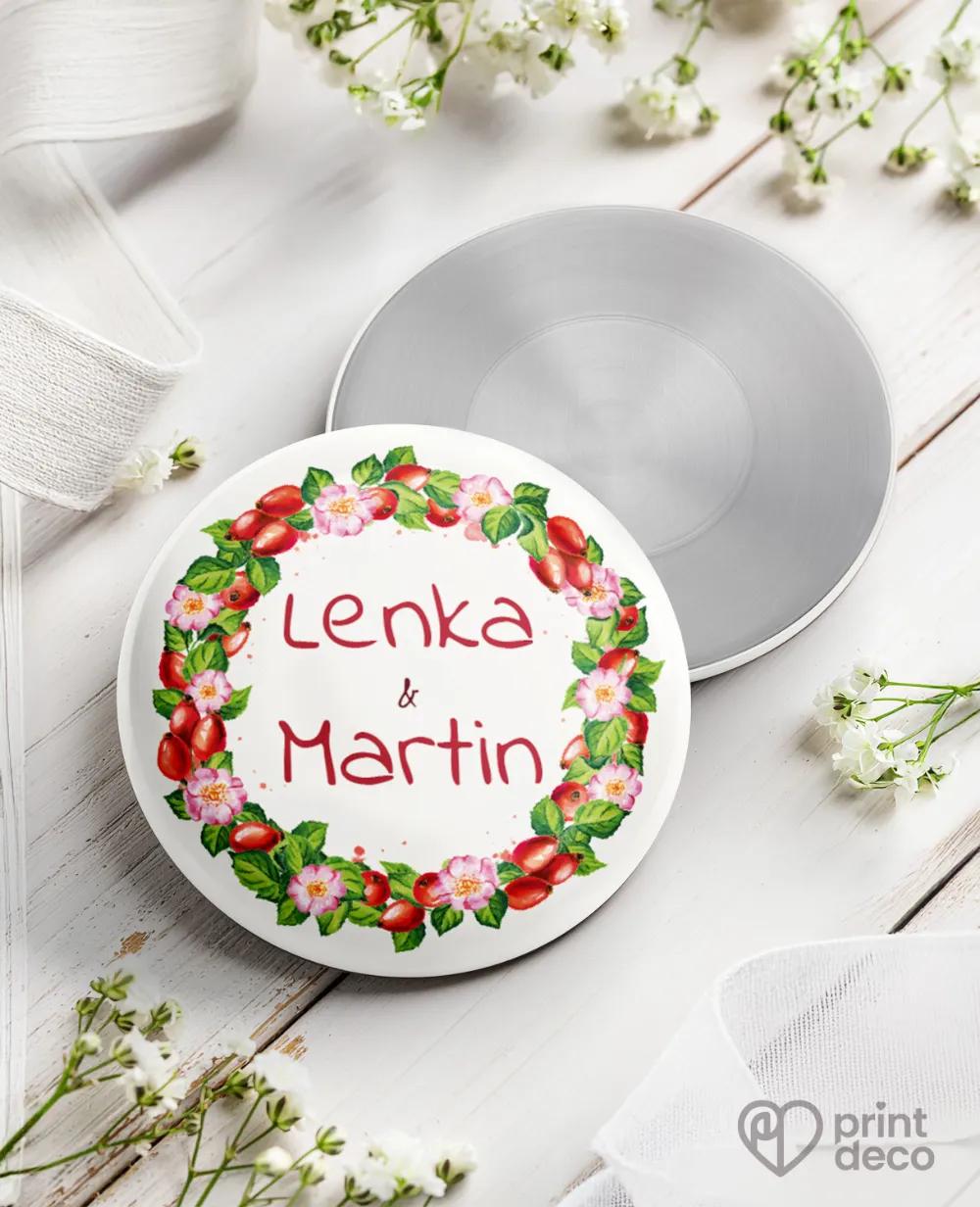Kruhová svatební magnetka s iniciálami ve věnečku jako originální svatební placka pro hosty. Elegantní památka, která uchová vzpomínku na váš velký den.