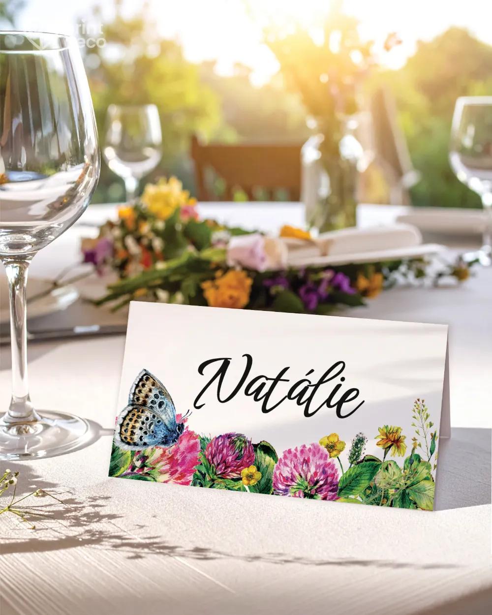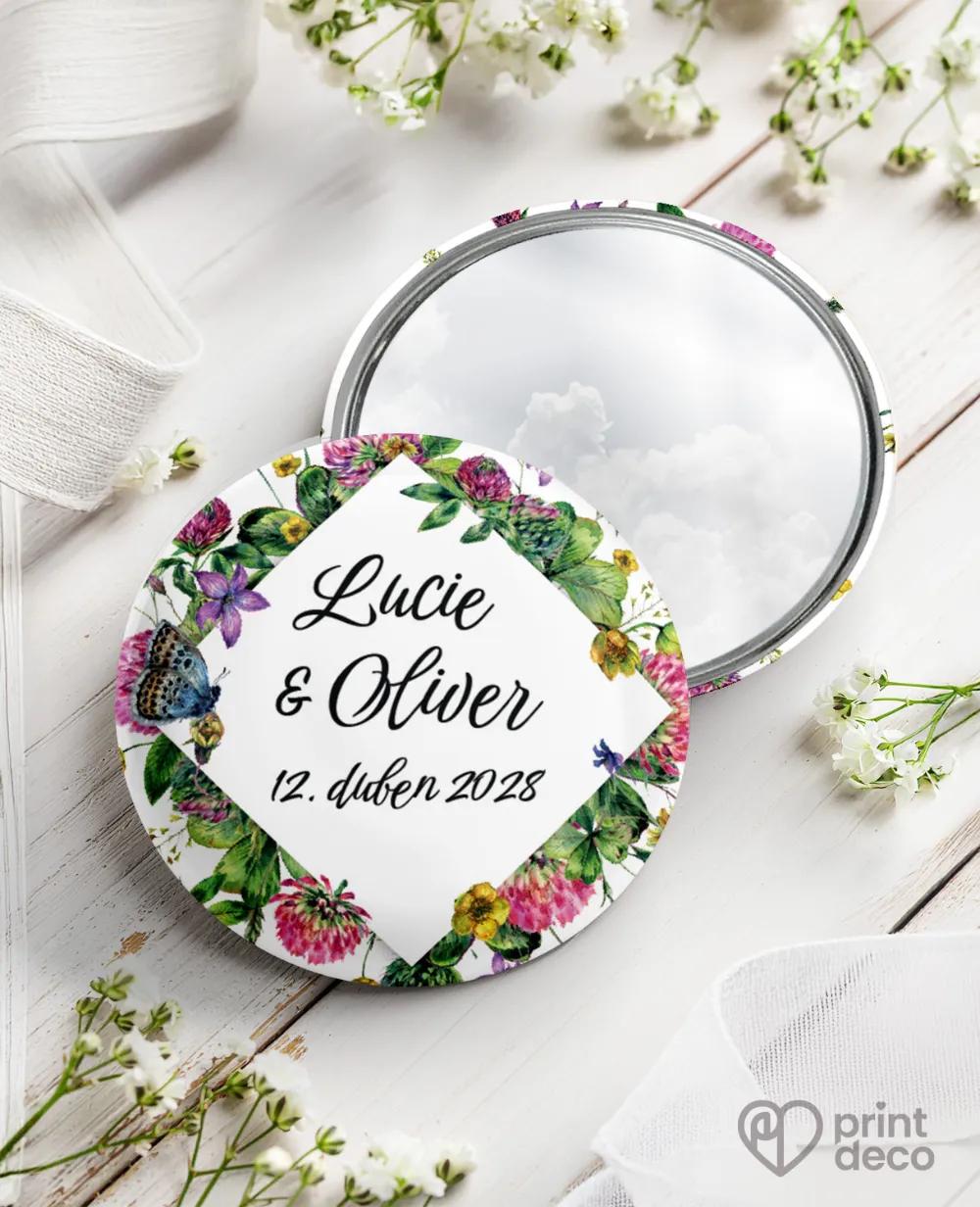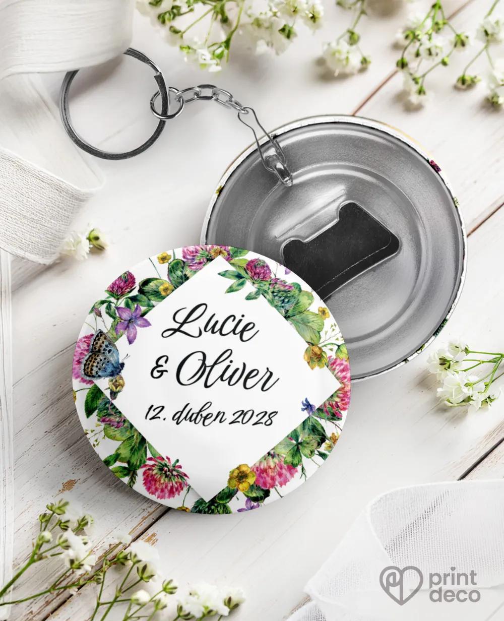 Kruhová svatební magnetka s decentním květinovým motivem a modrým motýlem vnese do výzdoby lehkost a romantiku. Stylová svatební placka je elegantním poděkováním hostům a krásnou vzpomínkou na váš den. Personalizace jmény a datem dodá osobní význam. Harmonicky zapadne k jmenovkám, etiketám, samolepkám, menu a mnoha dalším tiskovinám ve stejném stylu a dotvoří dokonalou atmosféru.