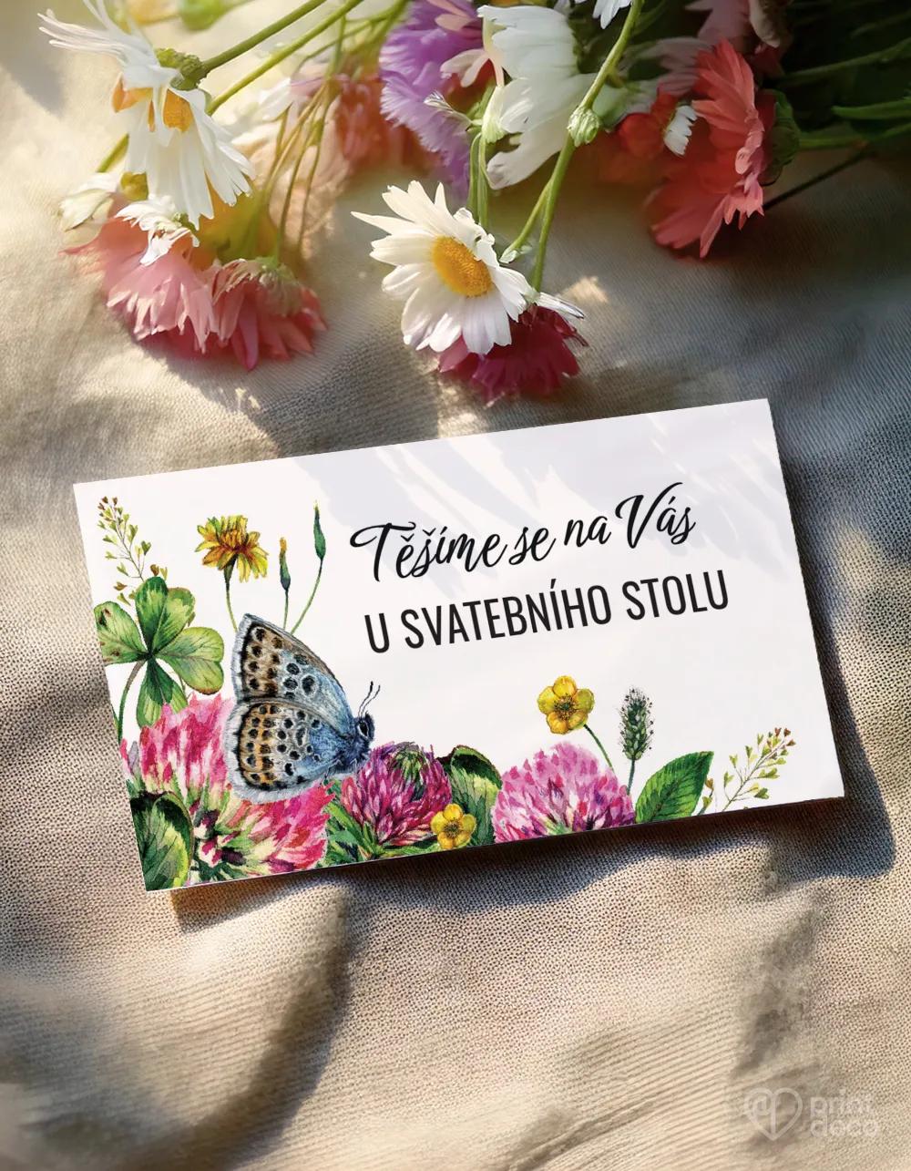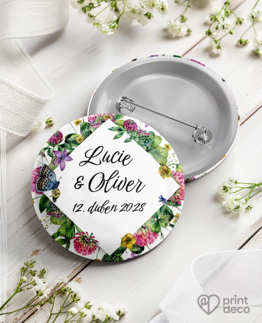 Kruhová svatební magnetka s motivem polních květů a modrého motýla jako svěží svatební placka a romantická památka na váš den pro hosty.