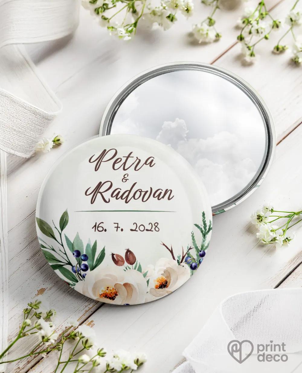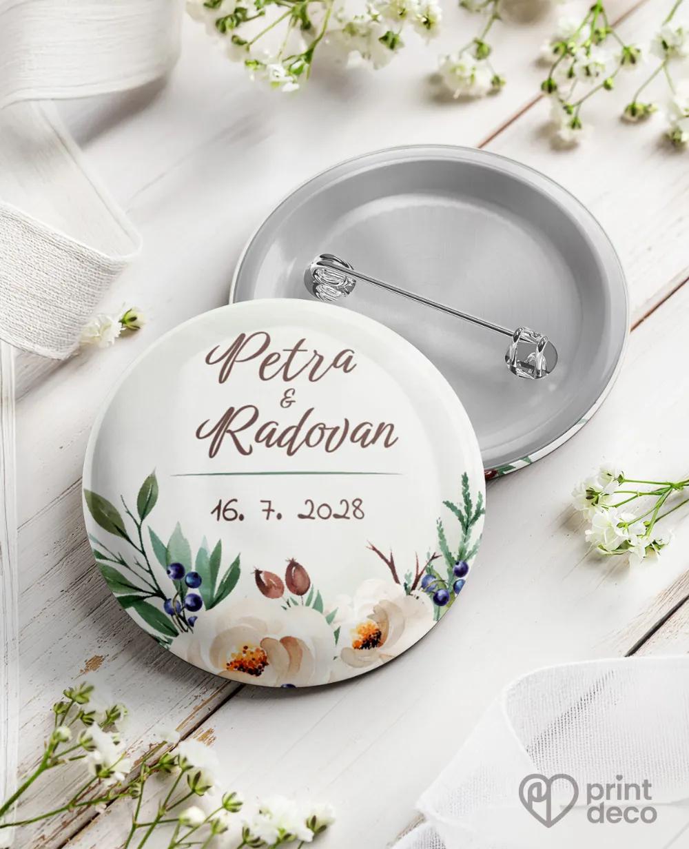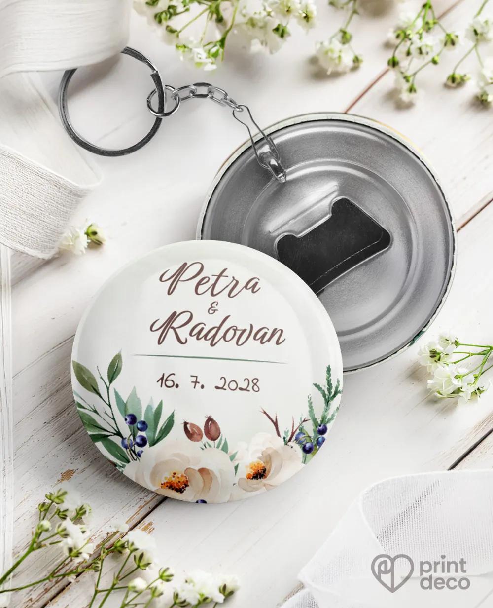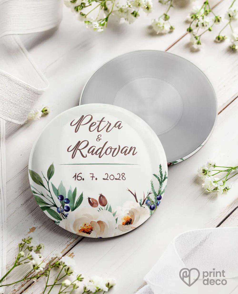 Svatební magnetka s lesním motivem a květinami v parožích jako originální poděkování hostům z vaší svatby.