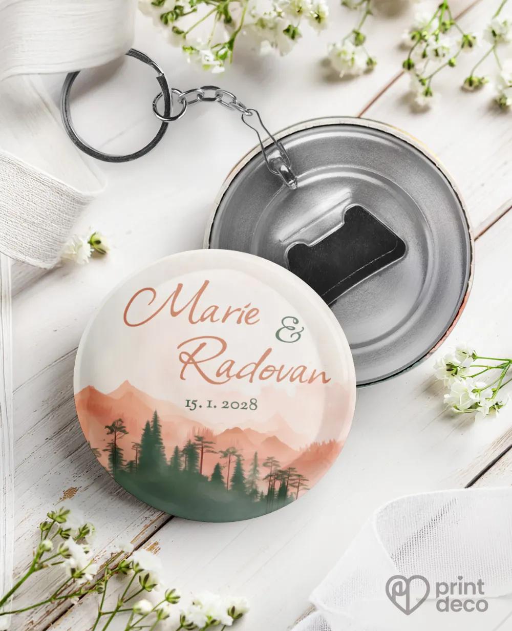 Svatební magnetka s jemným akvarelovým motivem červených hor a zelených stromů jako originální vzpomínka pro hosty na váš velký den a stylový dárek ze svatby.