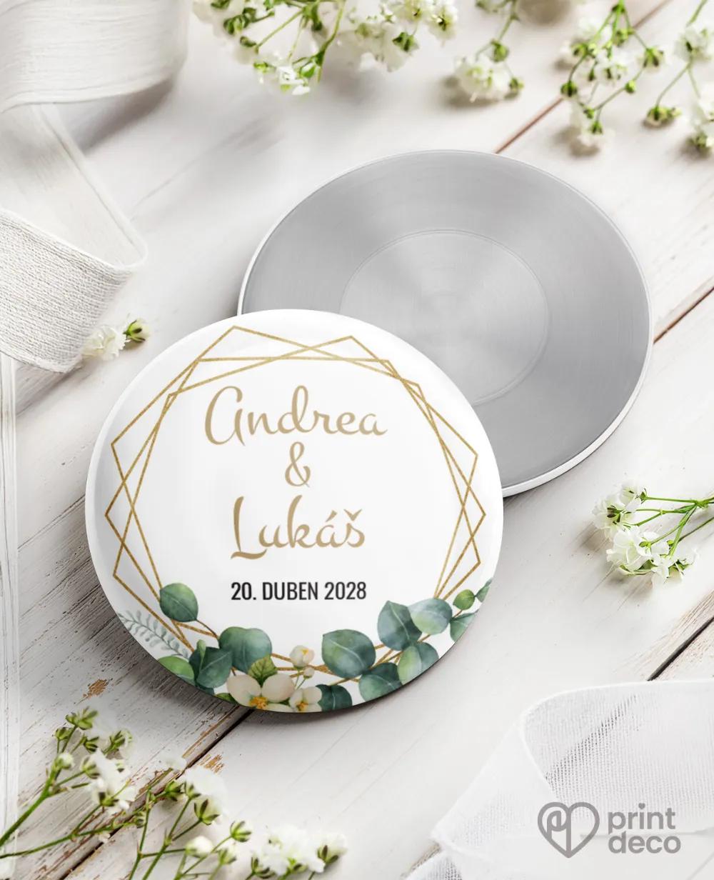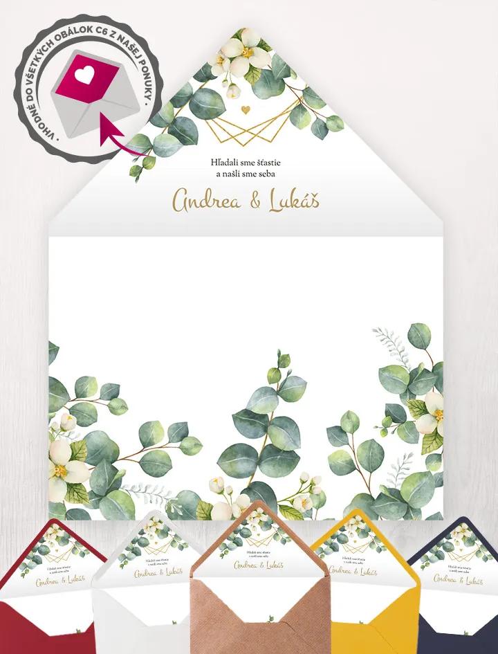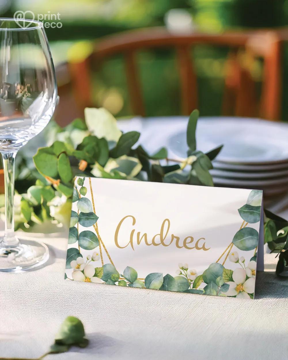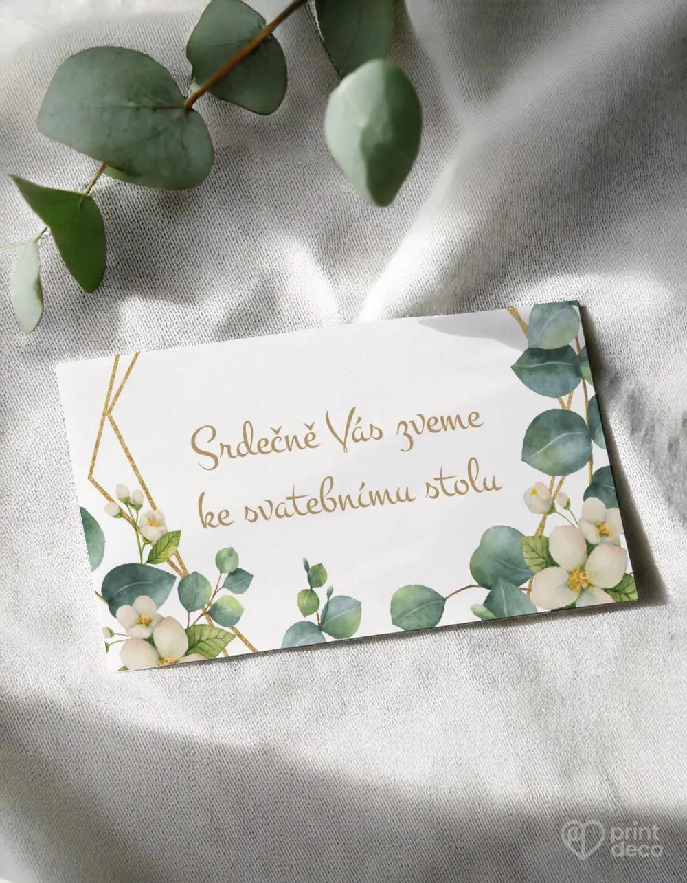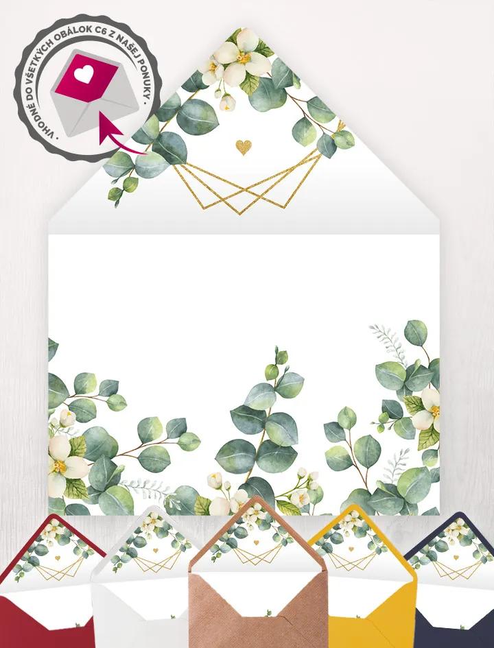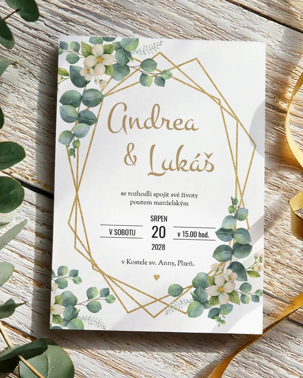 Toto svatební menu okouzlí jemným a elegantním designem s motivem svěžího eukalyptu a bílých květin, doplněným o zlaté geometrické detaily. Moderní zpracování v kombinaci s jemnými odstíny zelené a bílé působí svěže a nadčasově, díky čemuž skvěle zapadne do výzdoby svatební hostiny. Menu je vhodné pro elegantní, minimalistické i přírodně laděné svatby, kde se snoubí přirozenost s luxusním detailem.