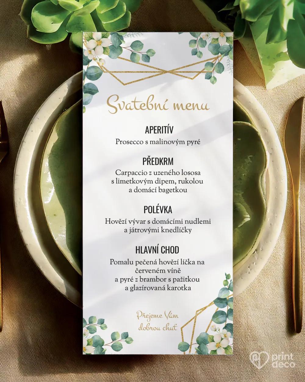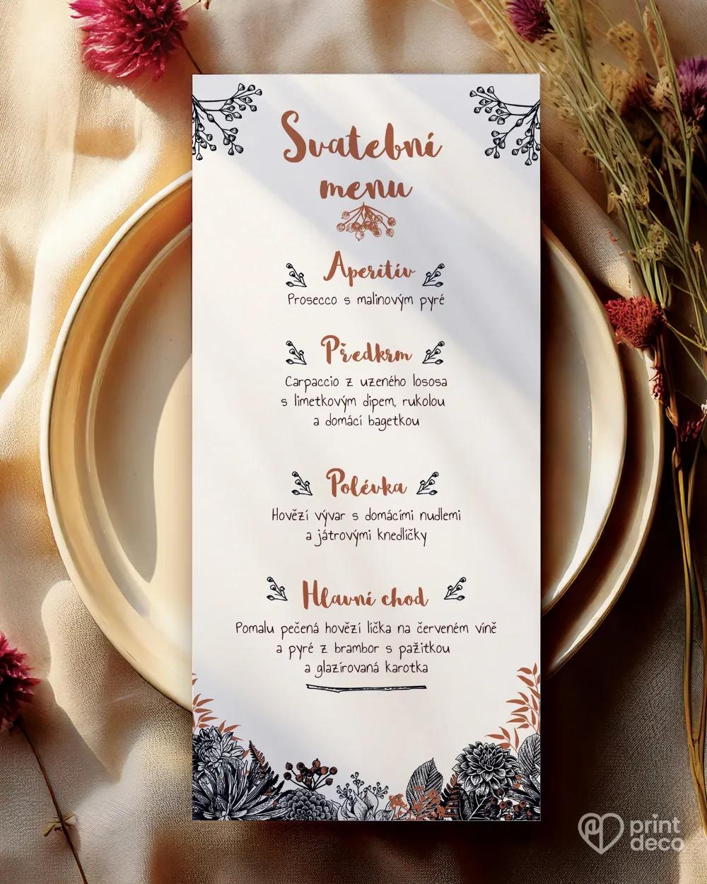 Svatební menu s jemným motivem sedmikrásek potěší každého hosta svou svěžestí a něhou. Zelené písmo a kreslené květy evokují jaro, lehkost a přirozenou krásu, což z něj činí ideální doplněk pro svatby v přírodním, rustikálním či boho stylu. Tento design skvěle zapadne k bílé, pastelové a zelené výzdobě. Text menu si můžete upravit podle vlastních představ, aby přesně vystihl váš výjimečný den.