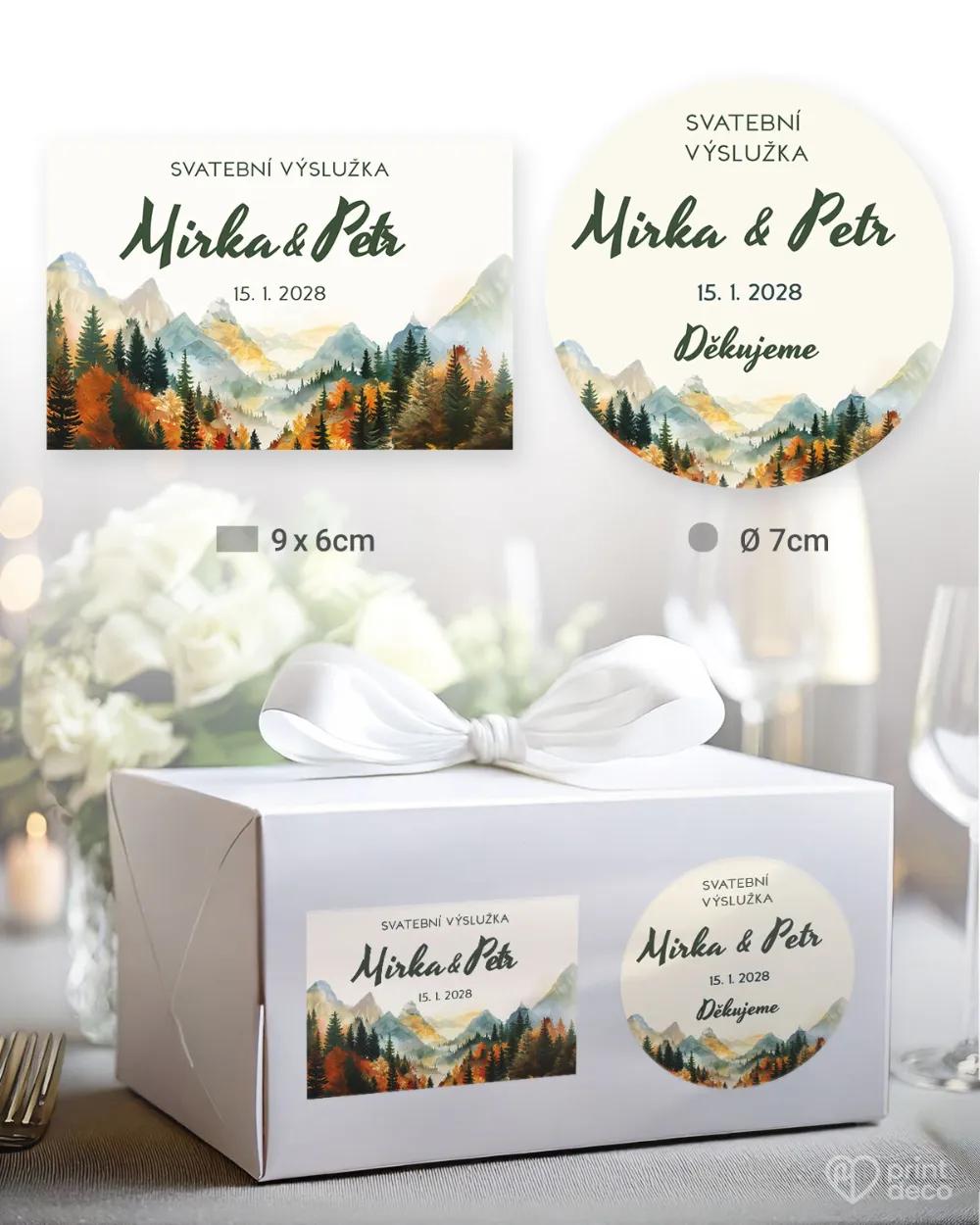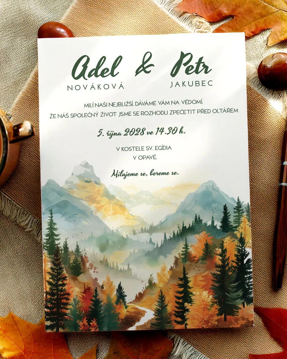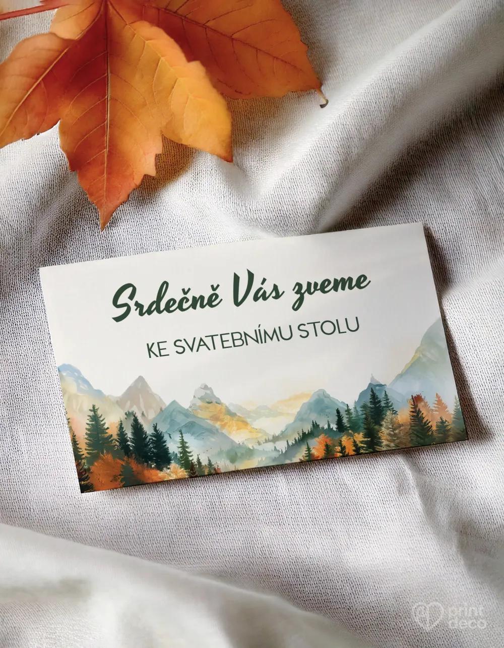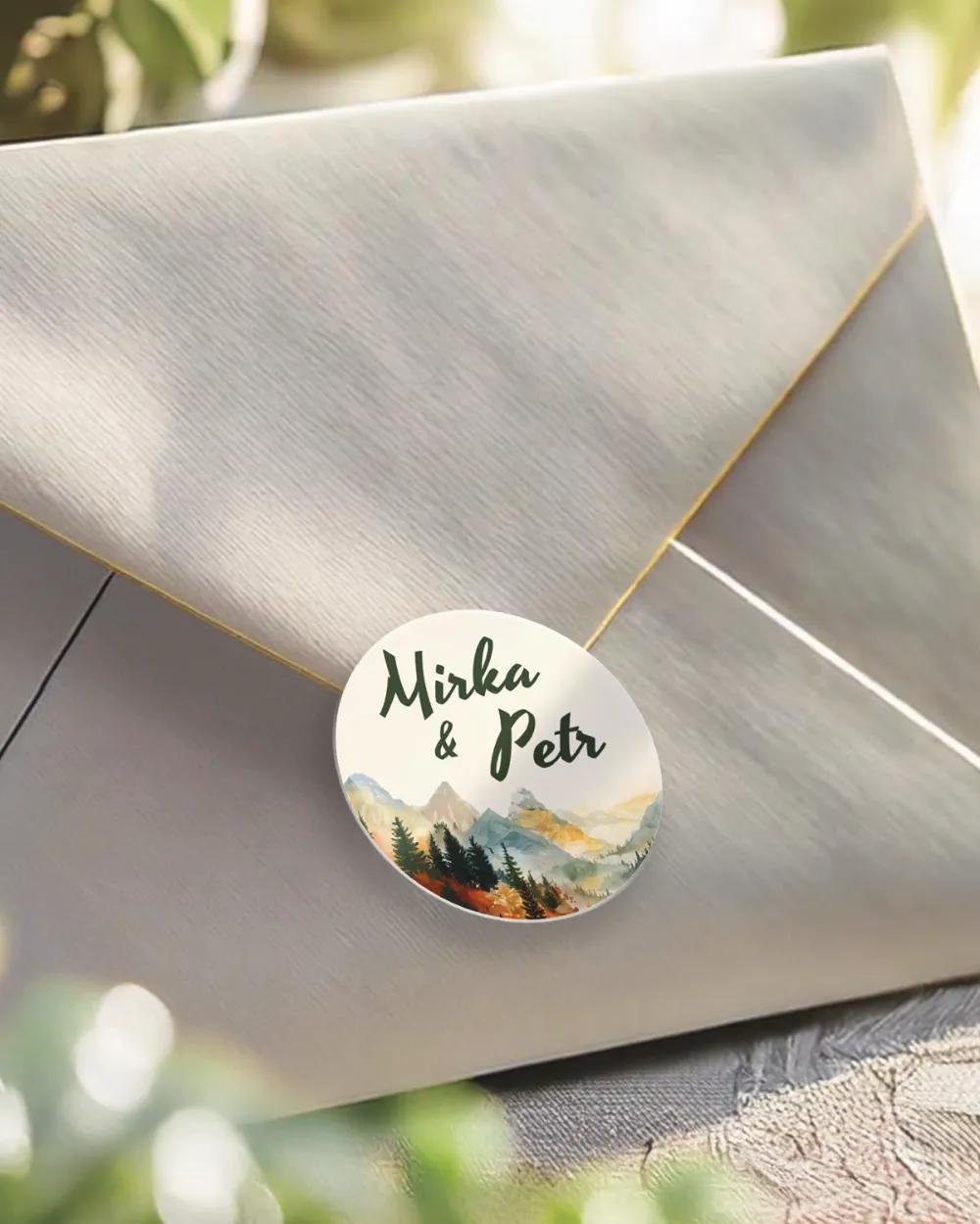 Kruhový kovový svatební odznak se zavíracím špendlíkem zdobí umělecký motiv podzimní horské krajiny s majestátními štíty a lesem v teplých tónech. Tento elegantní detail okouzlí hosty jako originální vzpomínka na váš velký den a potěší je jako dárek. Personalizace jmény a datem svatby mu dodá jedinečný charakter a autenticitu. Kvalitní kovové provedení a propracovaný design zaručí estetickou hodnotu i dlouhou životnost. Odznak můžete sladit s tiskovinami ve stejném stylu pro dokonalou souhru detailů.