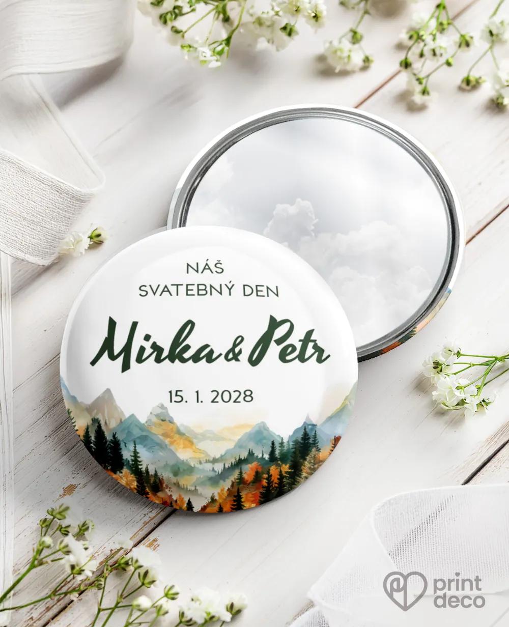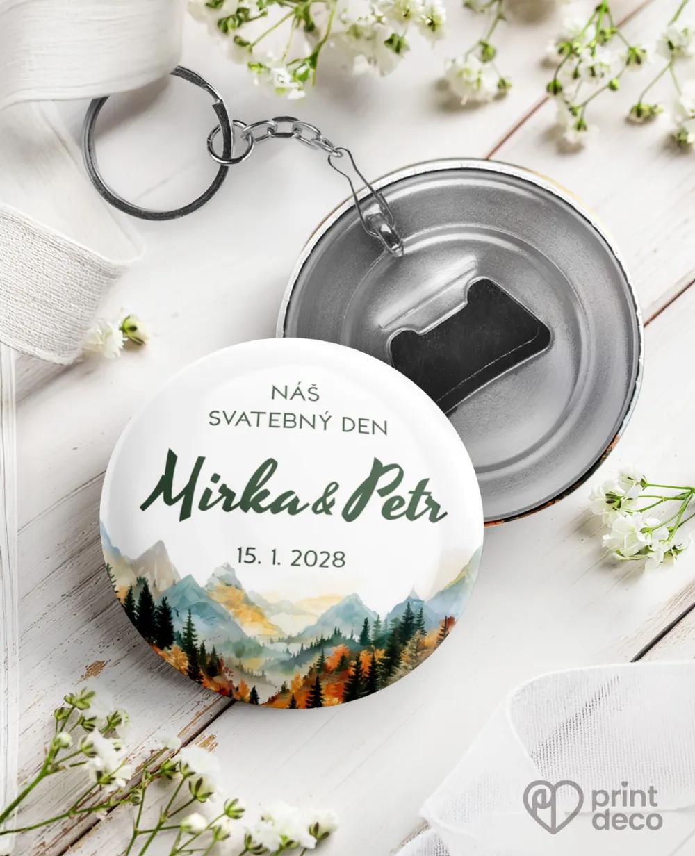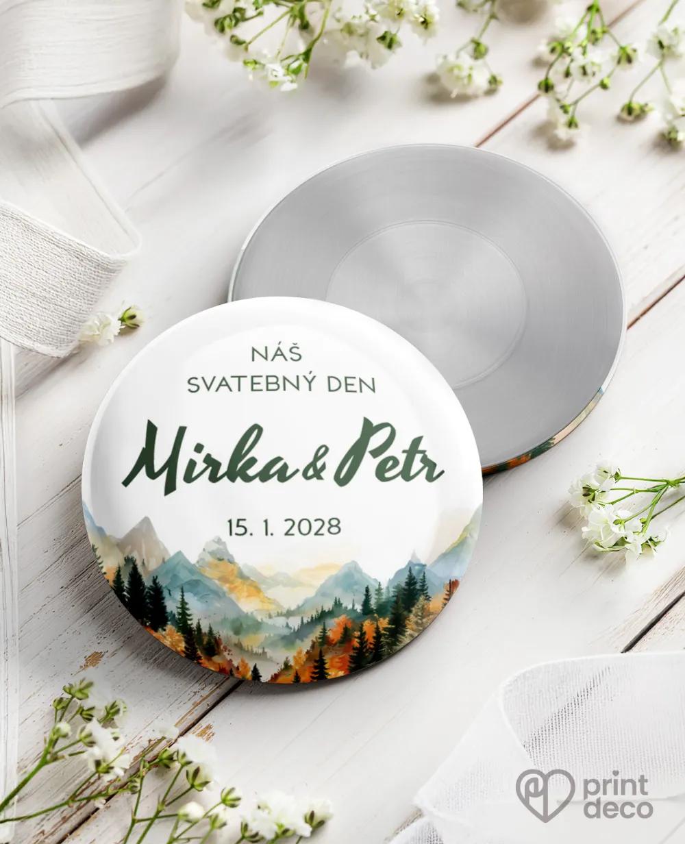 Kruhový kovový svatební odznak s podzimní horskou krajinou jako originální památka a dárek pro hosty, který jim uchová vzpomínku na váš velký den.