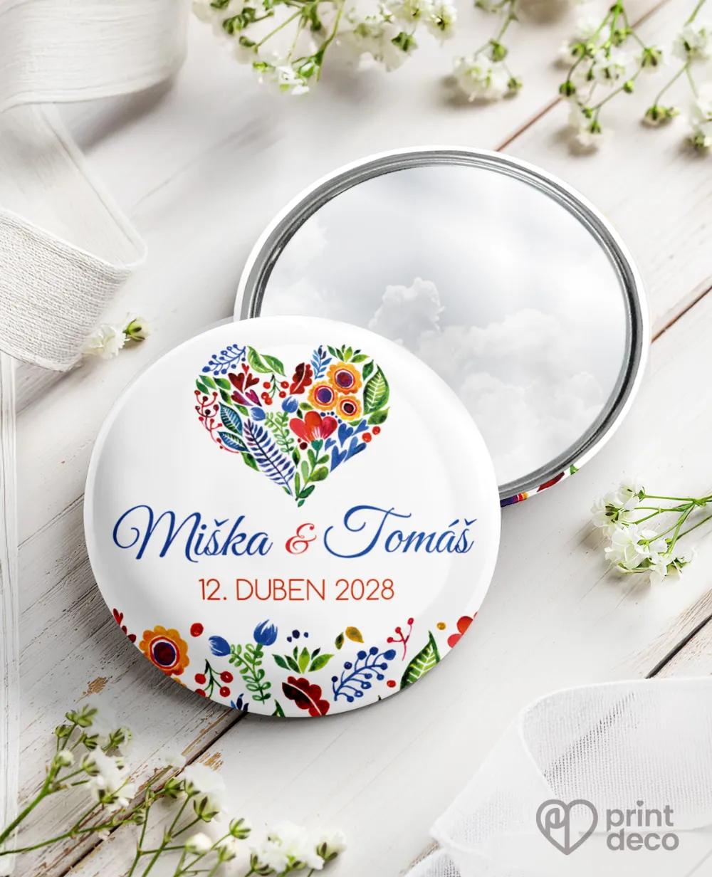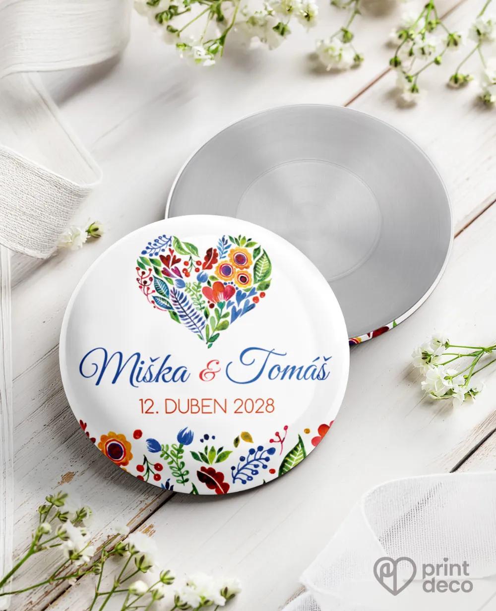 Kruhová kovová svatební placka s veselým folklorním motivem květů jako originální odznak se špendlíkem a milá památka pro hosty na váš den.