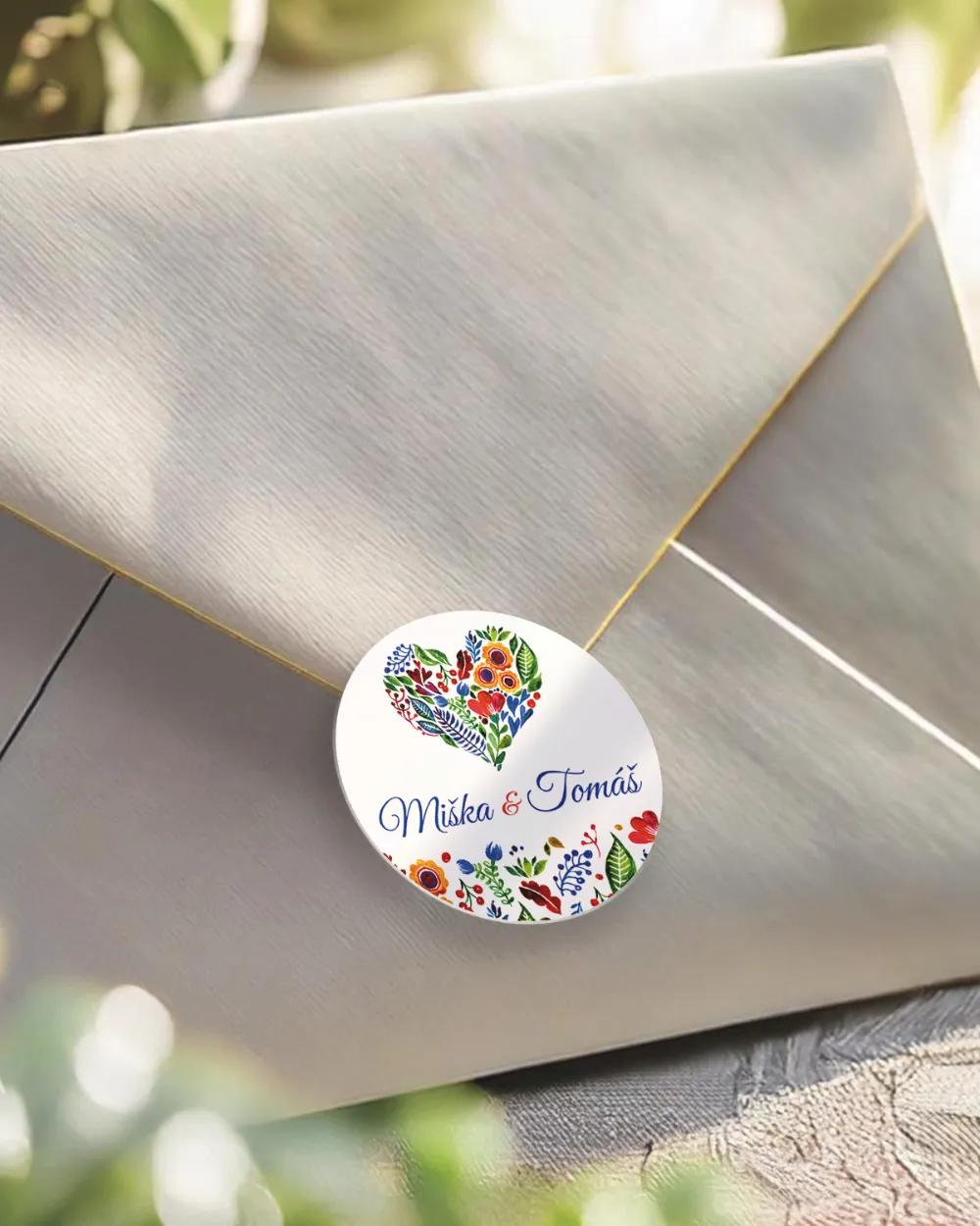 Štýlový kruhový kovový svadobný odznak so zatváracím špendlíkom a farebným ľudovým folklórnym motívom prinesie na váš svadobný stôl radosť a tradíciu. Je krásnou pamiatkou na svadbu a originálnym darčekom, ktorý si hostia radi uchovajú ako spomienku na váš výnimočný deň. Personalizácia textu menami, dátumom či krátkym odkazom dodá odznaku jedinečný a osobitý charakter. Folklórny dizajn ideálne dopĺňa výzdobu v ľudovom alebo rustikálnom štýle a ladí s tlačovinami rovnakého motívu.