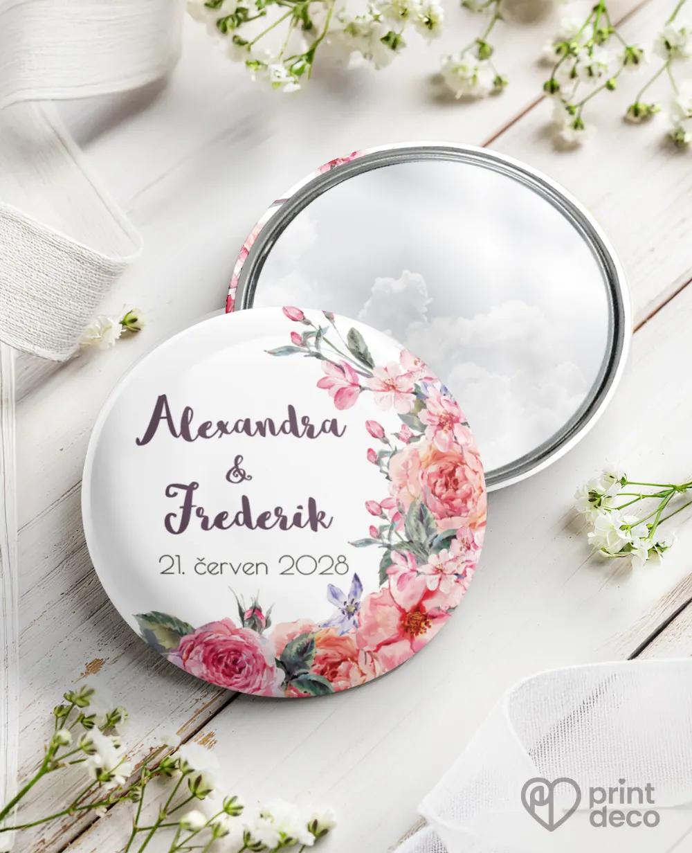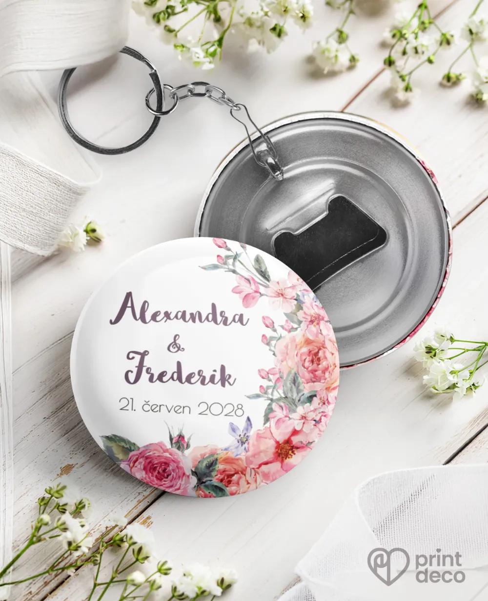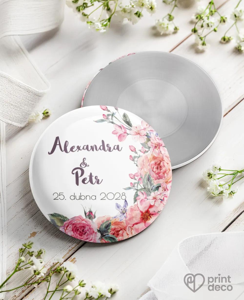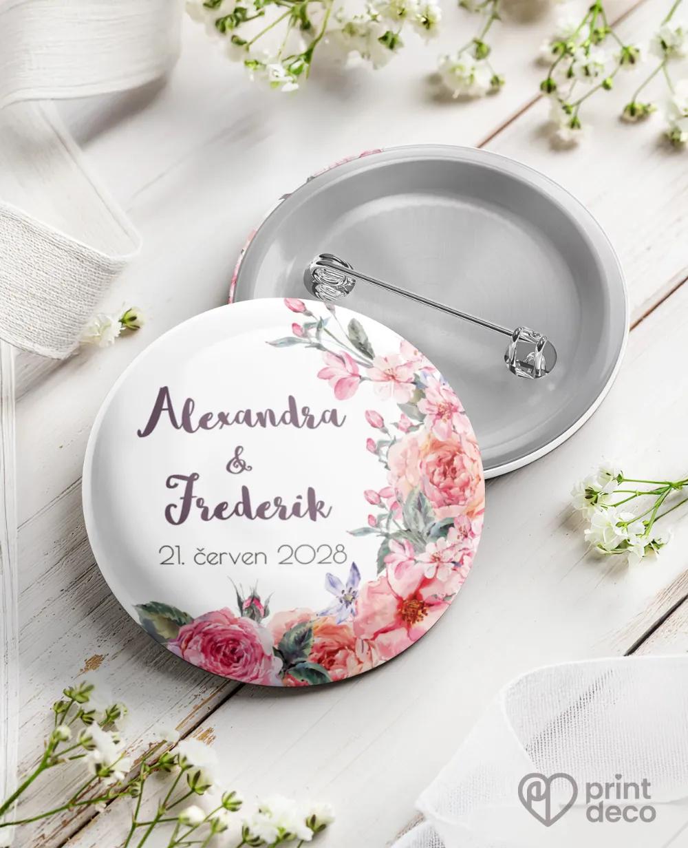 Kruhová kovová svatební placka s bohatým romantickým květinovým motivem jako milá památka a originální odznak se špendlíkem pro hosty na váš výjimečný den.
