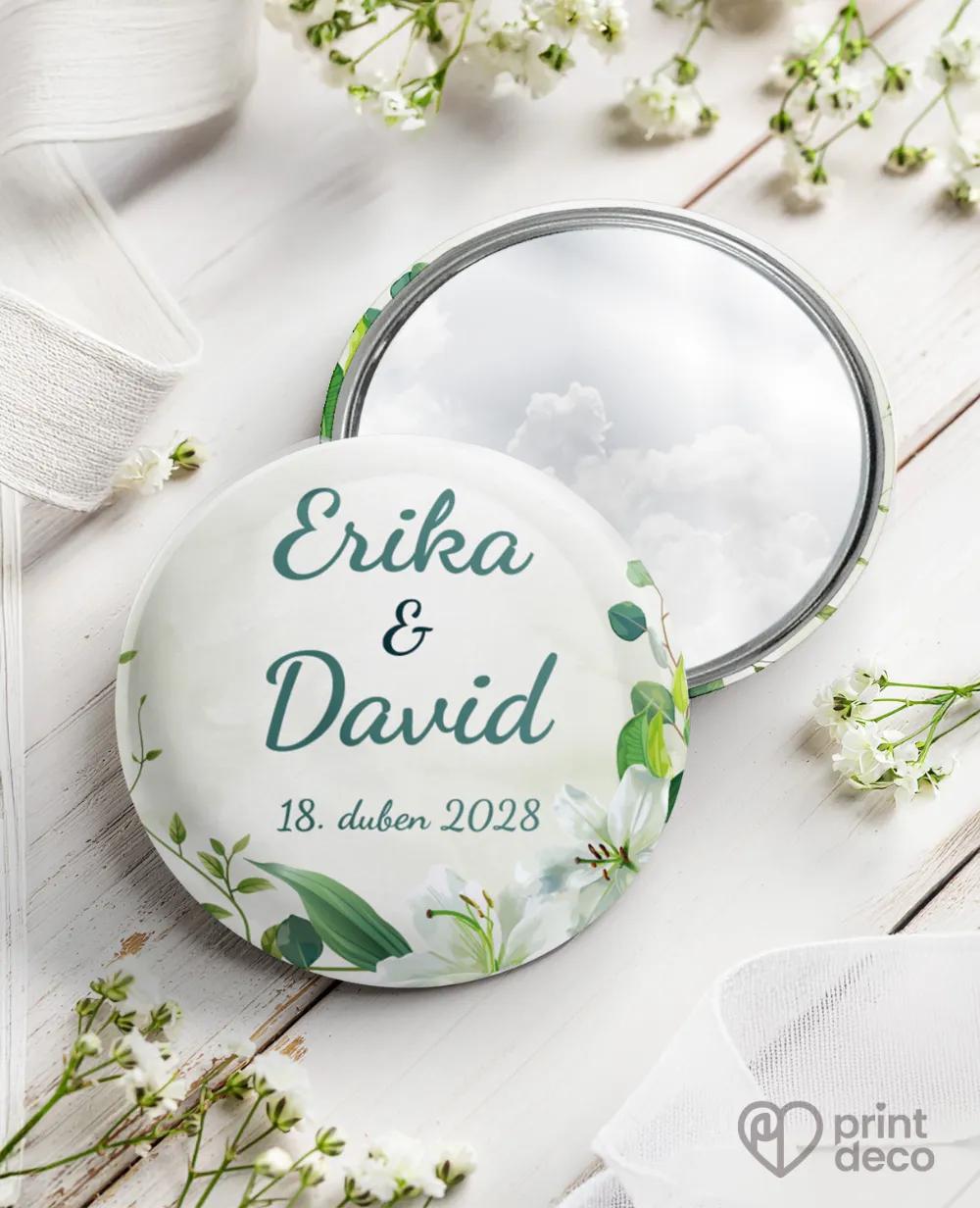 Kovová kruhová klíčenka s otvírákem s motivem bílých lilií a zeleně jako elegantní dárek pro hosty. Úprava zdarma přes online editor, sladění s dalšími tiskovinami.