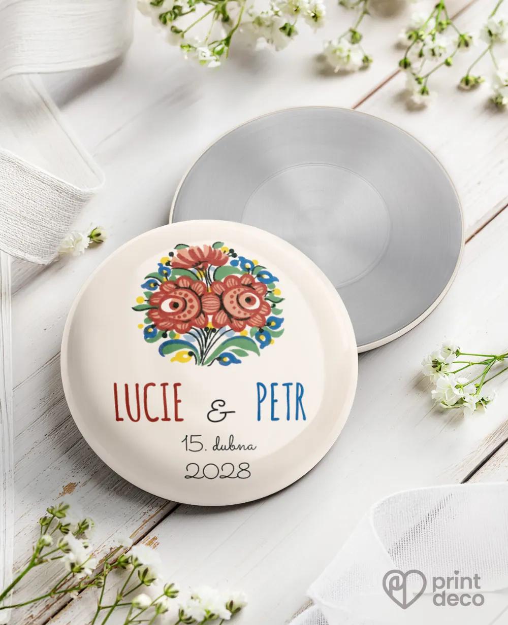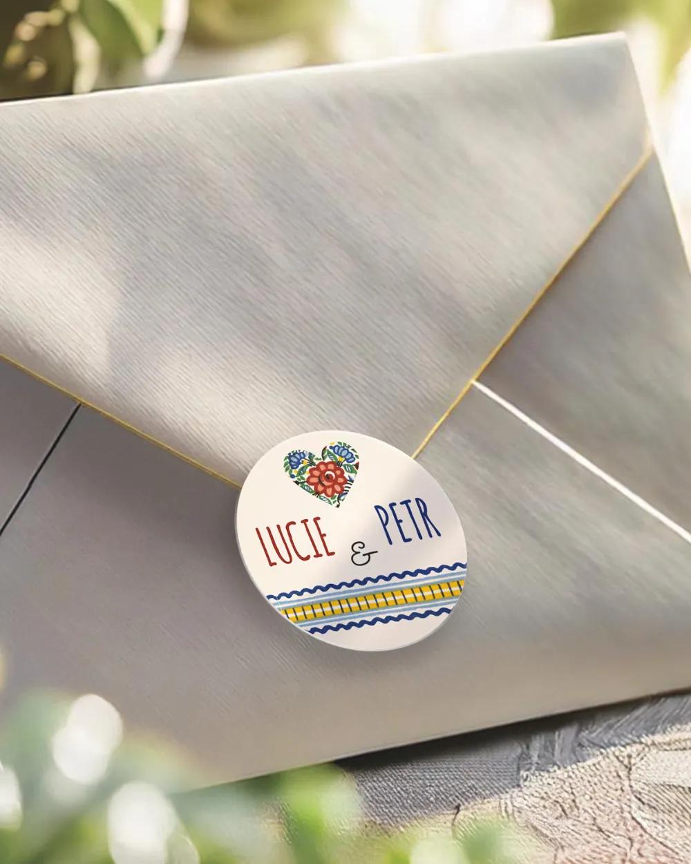Svatební klíčenka s otvírákem v kulatém kovovém provedení s veselým motivem folklórních srdíček a barevné stužky přinese na váš stůl radost a tradici. Tento stylový dárek pro hosty zaujme svým lidovým vzhledem i osobním kouzlem. Díky možnosti úpravy zdarma v online editoru si snadno přidáte jména a datum. Motiv skvěle ladí se svatbami v rustikálním, folklórním nebo přírodním stylu. Klíčenku můžete kombinovat s dalšími tiskovinami ve stejném designu – jmenovkami, etiketami, magnetkami a dalšími.