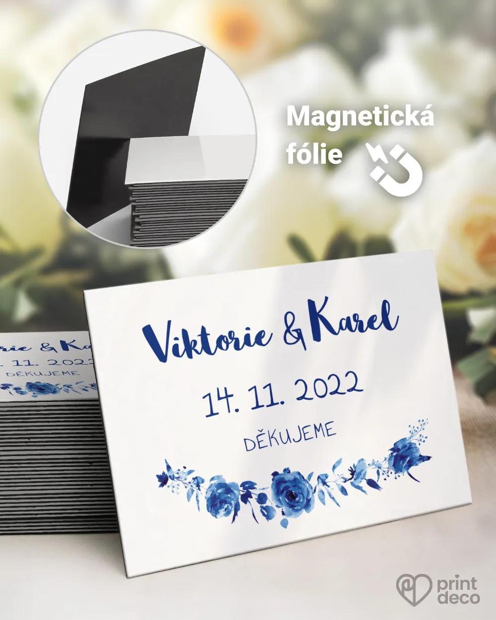 Svatební klíčenka s otvírákem v kovovém kruhovém provedení s akvarelovým motivem modrých lidových květů vnáší do výzdoby jemnou tradici a noblesní vzhled. Tento originální dárek pro hosty si snadno přizpůsobíte díky úpravě zdarma přes online editor – jména i datum svatby doplníte podle vlastních představ. Motiv se výborně hodí ke svatbám v elegantním, folklorním i klasickém stylu. Klíčenku můžete kombinovat s dalšími tiskovinami ve stejném designu – jmenovkami, etiketami, magnetkami nebo samolepkami.