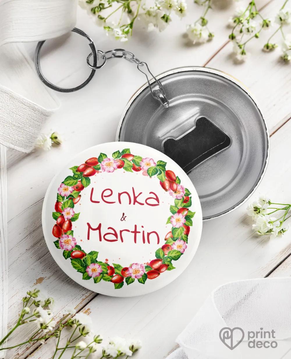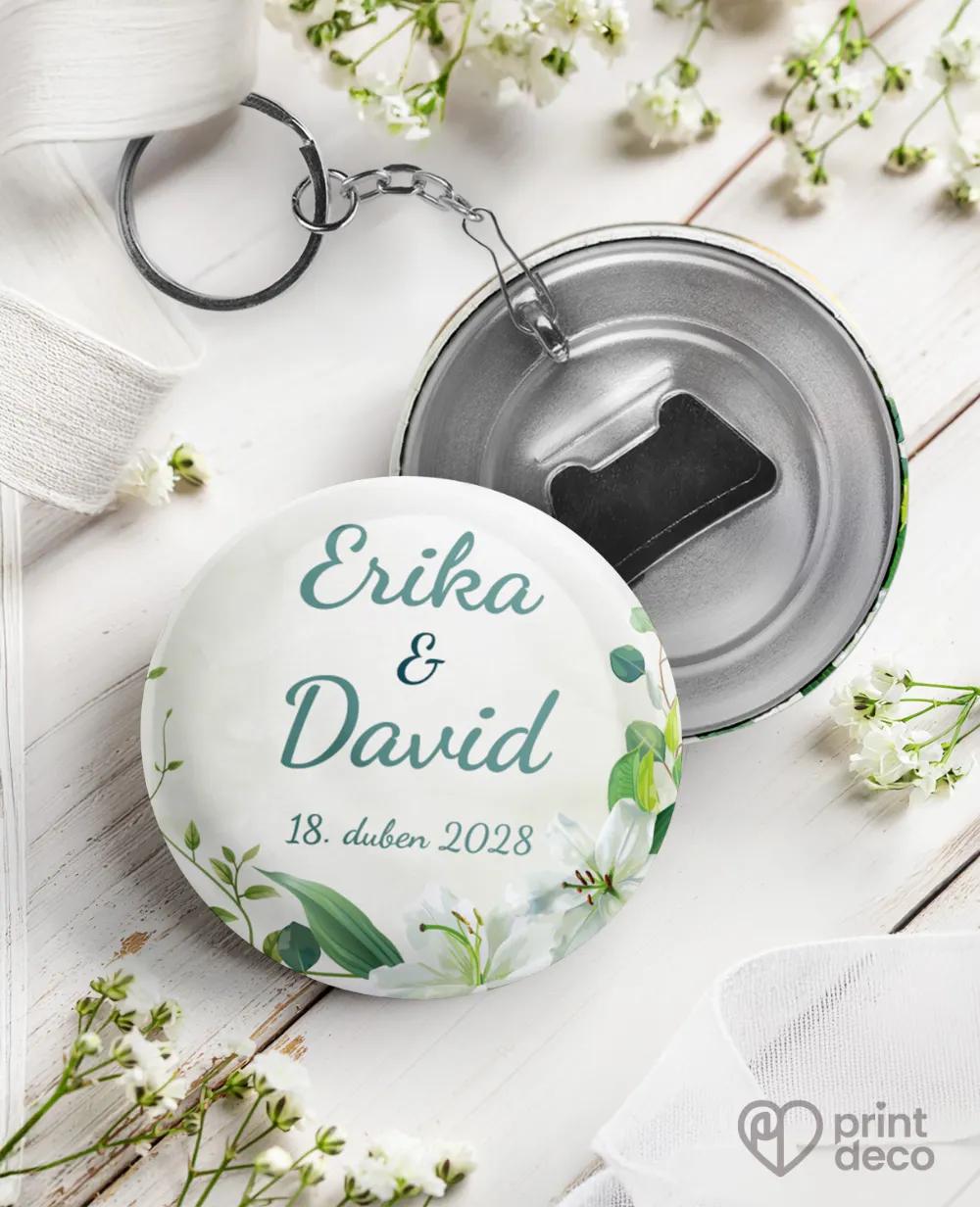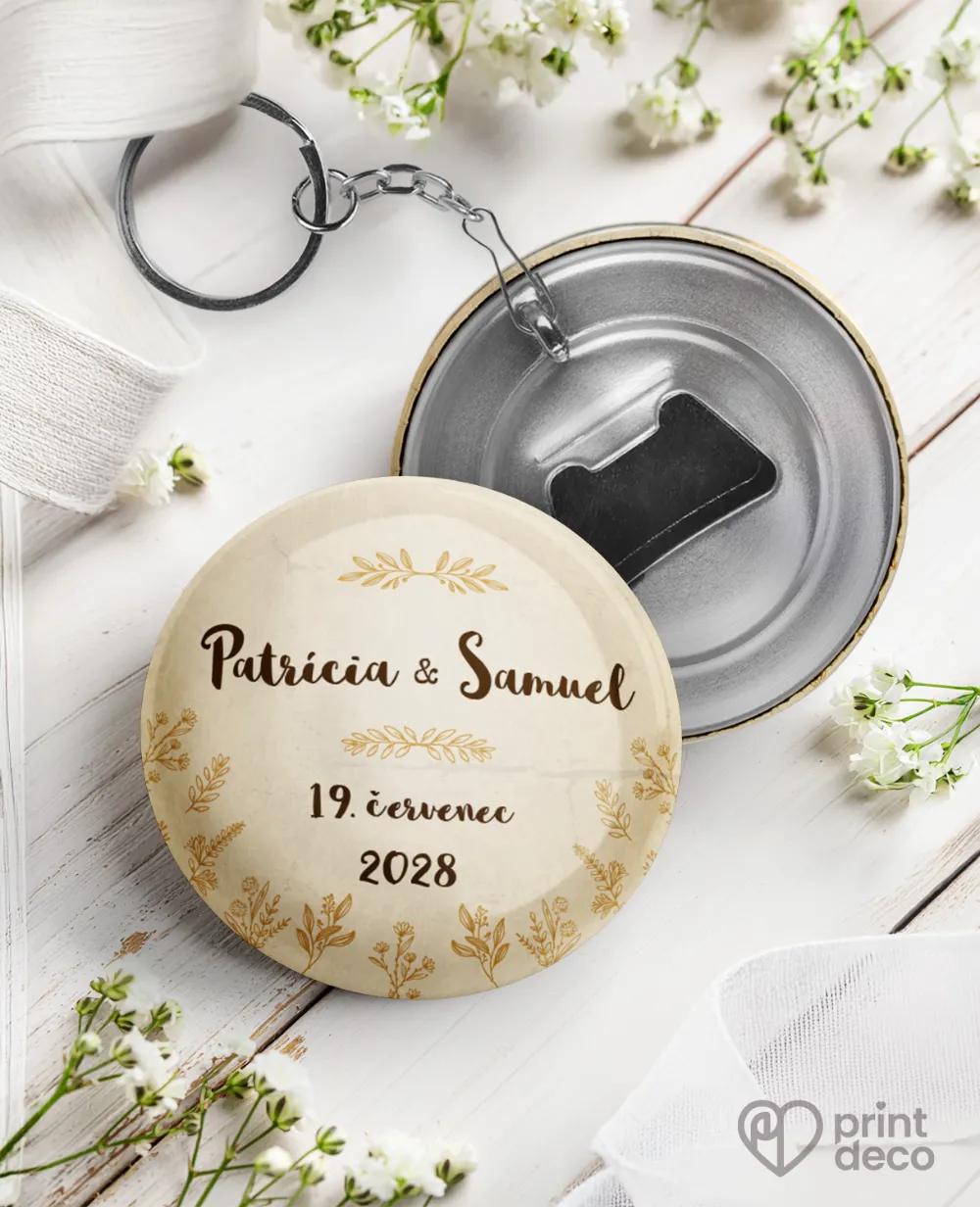 Kulatá kovová svatební klíčenka s otvírákem a jemným vintage motivem dvou prstýnků je elegantním a praktickým dárkem pro hosty, kteří ocení styl i funkčnost. Romantický design s nostalgickým nádechem doplní vaši výzdobu o vkusný detail a zanechá krásnou vzpomínku na váš den. Personalizace je možná zdarma přes online editor – přidejte jména i datum svatby. Klíčenka slouží jako dekorativní doplněk, suvenýr i otvírák na lahve. Pro harmonii ji snadno sladíte s dalšími svatebními tiskovinami ve stejném stylu – jmenovkami, magnetkami, etiketami na víno a dalšími.